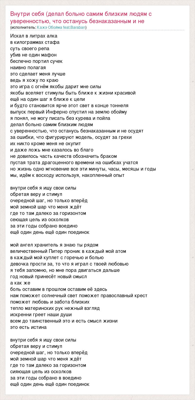 Искал в литрах алка в килограммах стафа суть своего репа убив не один мафон беспечно портил сучек наивно полагая это сделает меня лучше ведь я хожу по краю это игра с огнём якобы дарит мне силы якобы вселяет стимулы быть ближе к жизни красивой ещё на один шаг я ближе к цели и будто становится ярче этот свет в конце тоннеля выпуск первый Инферно спустил на землю обойму я понял, не могу писать без курева и пойла делал больно самим близким людям с уверенностью, что останусь безнаказанным и не осудят за ошибки, что фигурируют модель, осудят за грехи их никто кроме меня не окупит и даже ложь мне казалось во благо не довилось часть качеств обозначить браком пустая трата драгоценного времени на ошибках учатся но жизнь одно мгновение все эти минуты, часы, месяцы и годы мы, идём к восходу используя, накопленный опыт внутри себя я ищу свои силы обретая веру и стимул очередной шаг, но только вперёд мой земной шар что меня ждёт где то там далеко за горизонтом сеющая цель из осколков за эти годы собрано воедино ещё один день ещё один поединок мой ангел хранитель я знаю ты рядом величественный Питер проник в каждый мой атом в каждый мой куплет с горечью и болью девочка прости за, то что я играл с твоей любовью я тебя запомню, но мне пора двигаться дальше год новый принесёт новый смысл а как же боль оставим в прошлом оставим её здесь нам поможет солнечный свет поможет православный крест поможет любовь и забота близких тепло материнских рук нежный взгляд искренни греет наши души всем до таинственный это и есть смысл жизни это есть истина внутри себя я ищу свои силы обретая веру и стимул очередной шаг, но только вперёд мой земной шар что меня ждёт где то там далеко за горизонтом сияющая цель из осколков за эти годы собрано в воедино ещё один день ещё один поединок