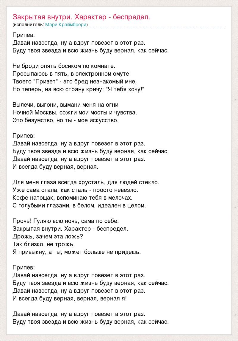 Припев: Давай навсегда, ну а вдруг повезет в этот раз. Буду твоя звезда и всю жизнь буду верная, как сейчас. Не броди опять босиком по комнате. Просыпаюсь в пять, в электронном омуте Твоего "Привет" - это бред незнакомый мне, Но теперь, на всю страну кричу: "Я тебя хочу!" Вылечи, выгони, вымани меня на огни Ночной Москвы, сожги мои мосты и чувства. Это безумство, но ты - мое искусство. Припев: Давай навсегда, ну а вдруг повезет в этот раз. Буду твоя звезда и всю жизнь буду верная, как сейчас. Давай навсегда, ну а вдруг повезет в этот раз. И всегда буду верная, верная. Для меня глаза всегда хрусталь, для людей стекло. Уже сама стала, как сталь - просто невезло. Кофе натощак, вспоминаю тебя в мелочах. С голубыми глазами, в белом, идеален в целом. Прочь! Гуляю всю ночь, сама по себе. Закрытая внутри. Характер - беспредел. Дрожь, зачем эта ложь? Так близко, не трожь. Я привыкну, а ты, может больше не придешь. Припев: Давай навсегда, ну а вдруг повезет в этот раз. Буду твоя звезда и всю жизнь буду верная, как сейчас. Давай навсегда, ну а вдруг повезет в этот раз. И всегда буду верная, верная, верная я! Давай навсегда, ну а вдруг повезет в этот раз. Буду твоя звезда и всю жизнь буду верная, как сейчас.