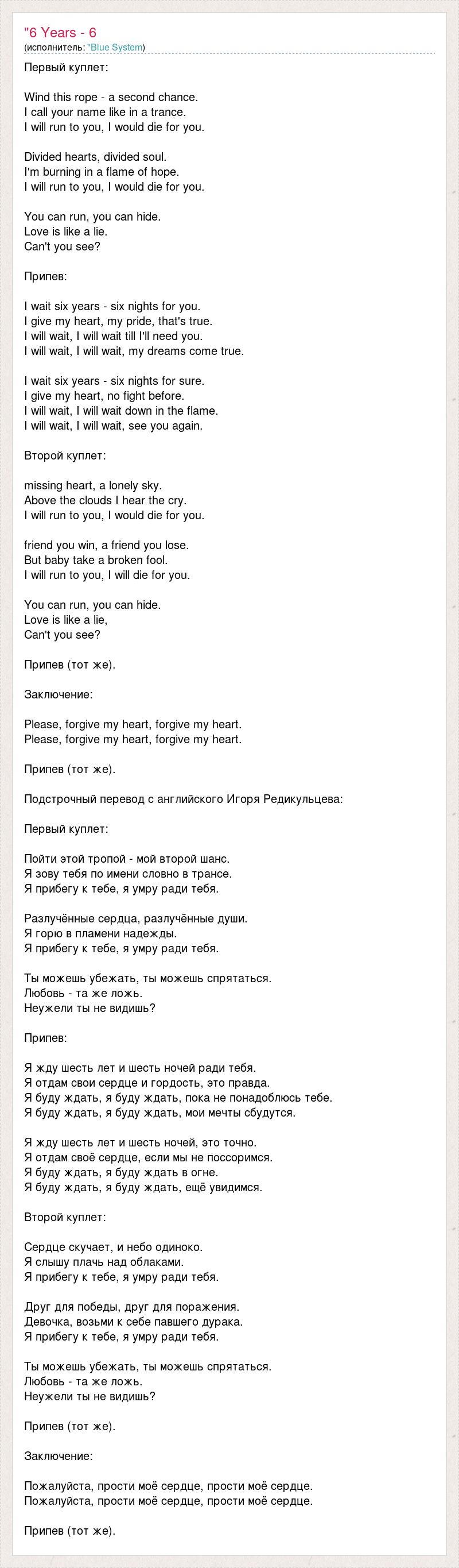 Первый куплет: Wind this rope - a second chance. I call your name like in a trance. I will run to you, I would die for you. Divided hearts, divided soul. I'm burning in a flame of hope. I will run to you, I would die for you. You can run, you can hide. Love is like a lie. Can't you see? Припев: I wait six years - six nights for you. I give my heart, my pride, that's true. I will wait, I will wait till I'll need you. I will wait, I will wait, my dreams come true. I wait six years - six nights for sure. I give my heart, no fight before. I will wait, I will wait down in the flame. I will wait, I will wait, see you again. Второй куплет: missing heart, a lonely sky. Above the clouds I hear the cry. I will run to you, I would die for you. friend you win, a friend you lose. But baby take a broken fool. I will run to you, I will die for you. You can run, you can hide. Love is like a lie, Can't you see? Припев (тот же). Заключение: Please, forgive my heart, forgive my heart. Please, forgive my heart, forgive my heart. Припев (тот же). Подстрочный перевод с английского Игоря Редикульцева: Первый куплет: Пойти этой тропой - мой второй шанс. Я зову тебя по имени словно в трансе. Я прибегу к тебе, я умру ради тебя. Разлучённые сердца, разлучённые души. Я горю в пламени надежды. Я прибегу к тебе, я умру ради тебя. Ты можешь убежать, ты можешь спрятаться. Любовь - та же ложь. Неужели ты не видишь? Припев: Я жду шесть лет и шесть ночей ради тебя. Я отдам свои сердце и гордость, это правда. Я буду ждать, я буду ждать, пока не понадоблюсь тебе. Я буду ждать, я буду ждать, мои мечты сбудутся. Я жду шесть лет и шесть ночей, это точно. Я отдам своё сердце, если мы не поссоримся. Я буду ждать, я буду ждать в огне. Я буду ждать, я буду ждать, ещё увидимся. Второй куплет: Сердце скучает, и небо одиноко. Я слышу плачь над облаками. Я прибегу к тебе, я умру ради тебя. Друг для победы, друг для поражения. Девочка, возьми к себе павшего дурака. Я прибегу к тебе, я умру ради тебя. Ты можешь убежать, ты можешь спрятаться. Любовь - та же ложь. Неужели ты не видишь? Припев (тот же). Заключение: Пожалуйста, прости моё сердце, прости моё сердце. Пожалуйста, прости моё сердце, прости моё сердце. Припев (тот же).