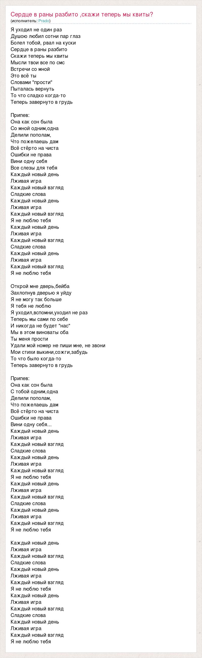 Я уходил не один раз Душою любил сотни пар глаз Болел тобой, рвал на куски Сердце в раны разбито Скажи теперь мы квиты Мысли твои все по смс Встречи со мной Это всё ты Словами "прости" Пыталась вернуть То что сладко когда-то Теперь завернуто в грудь Припев: Она как сон была Со мной одним,одна Делили пополам, Что пожелаешь дам Всё стёрто на чиста Ошибки не права Вини одну себя Все слезы для тебя Каждый новый день Лживая игра Каждый новый взгляд Сладкие слова Каждый новый день Лживая игра Каждый новый взгляд Я не люблю тебя Каждый новый день Лживая игра Каждый новый взгляд Сладкие слова Каждый новый день Лживая игра Каждый новый взгляд Я не люблю тебя Открой мне дверь,бейба Захлопнув дверью я уйду Я не могу так больше Я тебя не люблю Я уходил,вспомни,уходил не раз Теперь мы сами по себе И никогда не будет "нас" Мы в этом виноваты оба Ты меня прости Удали мой номер не пиши мне, не звони Мои стихи выкини,сожги,забудь То что было когда-то Теперь завернуто в грудь Припев: Она как сон была С тобой одним,одна Делили пополам, Что пожелаешь дам Всё стёрто на чиста Ошибки не права Вини одну себя... Каждый новый день Лживая игра Каждый новый взгляд Сладкие слова Каждый новый день Лживая игра Каждый новый взгляд Я не люблю тебя Каждый новый день Лживая игра Каждый новый взгляд Сладкие слова Каждый новый день Лживая игра Каждый новый взгляд Я не люблю тебя Каждый новый день Лживая игра Каждый новый взгляд Сладкие слова Каждый новый день Лживая игра Каждый новый взгляд Я не люблю тебя Каждый новый день Лживая игра Каждый новый взгляд Сладкие слова Каждый новый день Лживая игра Каждый новый взгляд Я не люблю тебя