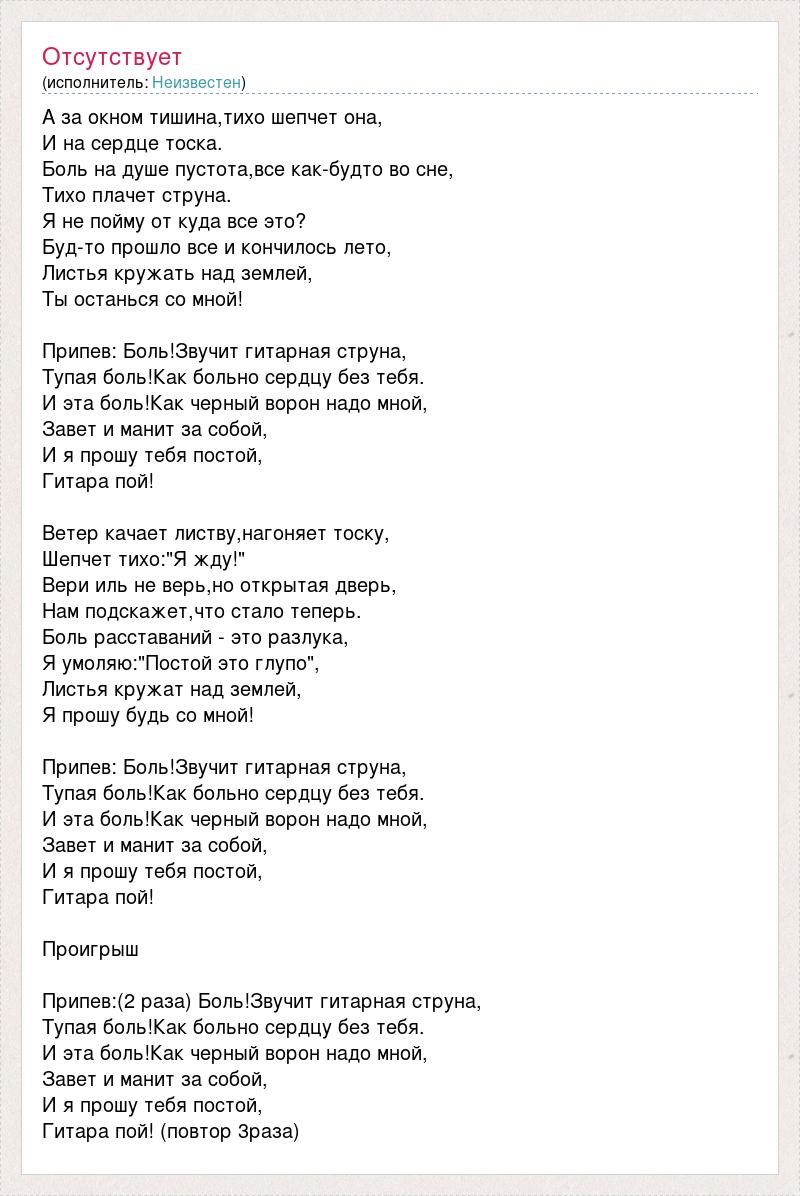 А за окном тишина,тихо шепчет она, И на сердце тоска. Боль на душе пустота,все как-будто во сне, Тихо плачет струна. Я не пойму от куда все это? Буд-то прошло все и кончилось лето, Листья кружать над землей, Ты останься со мной! Припев: Боль!Звучит гитарная струна, Тупая боль!Как больно сердцу без тебя. И эта боль!Как черный ворон надо мной, Завет и манит за собой, И я прошу тебя постой, Гитара пой! Ветер качает листву,нагоняет тоску, Шепчет тихо:"Я жду!" Вери иль не верь,но открытая дверь, Нам подскажет,что стало теперь. Боль расставаний - это разлука, Я умоляю:"Постой это глупо", Листья кружат над землей, Я прошу будь со мной! Припев: Боль!Звучит гитарная струна, Тупая боль!Как больно сердцу без тебя. И эта боль!Как черный ворон надо мной, Завет и манит за собой, И я прошу тебя постой, Гитара пой! Проигрыш Припев:(2 раза) Боль!Звучит гитарная струна, Тупая боль!Как больно сердцу без тебя. И эта боль!Как черный ворон надо мной, Завет и манит за собой, И я прошу тебя постой, Гитара пой! (повтор 3раза)