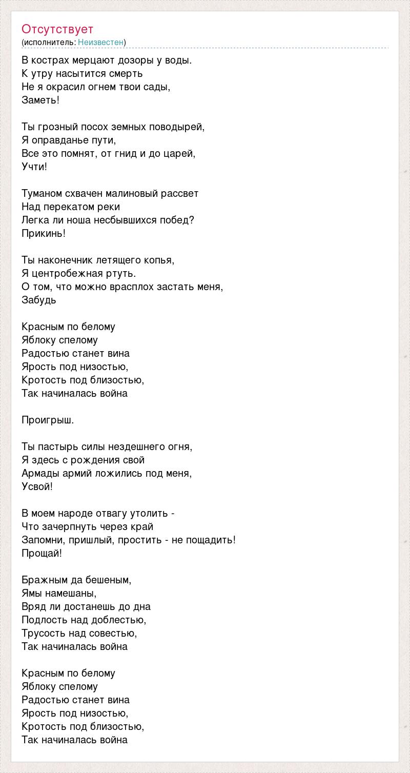 В кострах мерцают дозоры у воды. К утру насытится смерть Не я окрасил огнем твои сады, Заметь! Ты грозный посох земных поводырей, Я оправданье пути, Все это помнят, от гнид и до царей, Учти! Туманом схвачен малиновый рассвет Над перекатом реки Легка ли ноша несбывшихся побед? Прикинь! Ты наконечник летящего копья, Я центробежная ртуть. О том, что можно врасплох застать меня, Забудь Красным по белому Яблоку спелому Радостью станет вина Ярость под низостью, Кротость под близостью, Так начиналась война Проигрыш. Ты пастырь силы нездешнего огня, Я здесь с рождения свой Армады армий ложились под меня, Усвой! В моем народе отвагу утолить - Что зачерпнуть через край Запомни, пришлый, простить - не пощадить! Прощай! Бражным да бешеным, Ямы намешаны, Вряд ли достанешь до дна Подлость над доблестью, Трусость над совестью, Так начиналась война Красным по белому Яблоку спелому Радостью станет вина Ярость под низостью, Кротость под близостью, Так начиналась война