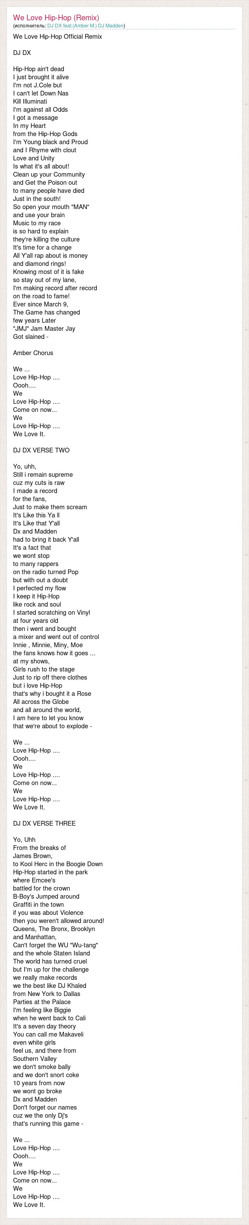 We Love Hip-Hop Official Remix DJ DX Hip-Hop ain't dead I just brought it alive I'm not J.Cole but I can't let Down Nas Kill Illuminati I'm against all Odds I got a message In my Heart from the Hip-Hop Gods I'm Young black and Proud and I Rhyme with clout Love and Unity Is what it's all about! Clean up your Community and Get the Poison out to many people have died Just in the south! So open your mouth "MAN" and use your brain Music to my race is so hard to explain they're killing the culture It's time for a change All Y'all rap about is money and diamond rings! Knowing most of it is fake so stay out of my lane, I'm making record after record on the road to fame! Ever since March 9, The Game has changed few years Later "JMJ" Jam Master Jay Got slained - Amber Chorus We ... Love Hip-Hop .... Oooh.... We Love Hip-Hop .... Come on now... We Love Hip-Hop .... We Love It. DJ DX VERSE TWO Yo, uhh, Still i remain supreme cuz my cuts is raw I made a record for the fans, Just to make them scream It's Like this Ya ll It's Like that Y'all Dx and Madden had to bring it back Y'all It's a fact that we wont stop to many rappers on the radio turned Pop but with out a doubt I perfected my flow I keep it Hip-Hop like rock and soul I started scratching on Vinyl at four years old then i went and bought a mixer and went out of control Innie , Minnie, Miny, Moe the fans knows how it goes ... at my shows, Girls rush to the stage Just to rip off there clothes but i love Hip-Hop that's why i bought it a Rose All across the Globe and all around the world, I am here to let you know that we're about to explode - We ... Love Hip-Hop .... Oooh.... We Love Hip-Hop .... Come on now... We Love Hip-Hop .... We Love It. DJ DX VERSE THREE Yo, Uhh From the breaks of James Brown, to Kool Herc in the Boogie Down Hip-Hop started in the park where Emcee's battled for the crown B-Boy's Jumped around Graffiti in the town if you was about Violence then you weren't allowed around! Queens, The Bronx, Brooklyn and Manhattan, Can't forget the WU "Wu-tang" and the whole Staten Island The world has turned cruel but I'm up for the challenge we really make records we the best like DJ Khaled from New York to Dallas Parties at the Palace I'm feeling like Biggie when he went back to Cali It's a seven day theory You can call me Makaveli even white girls feel us, and there from Southern Valley we don't smoke bally and we don't snort coke 10 years from now we wont go broke Dx and Madden Don't forget our names cuz we the only Dj's that's running this game - We ... Love Hip-Hop .... Oooh.... We Love Hip-Hop .... Come on now... We Love Hip-Hop .... We Love It.