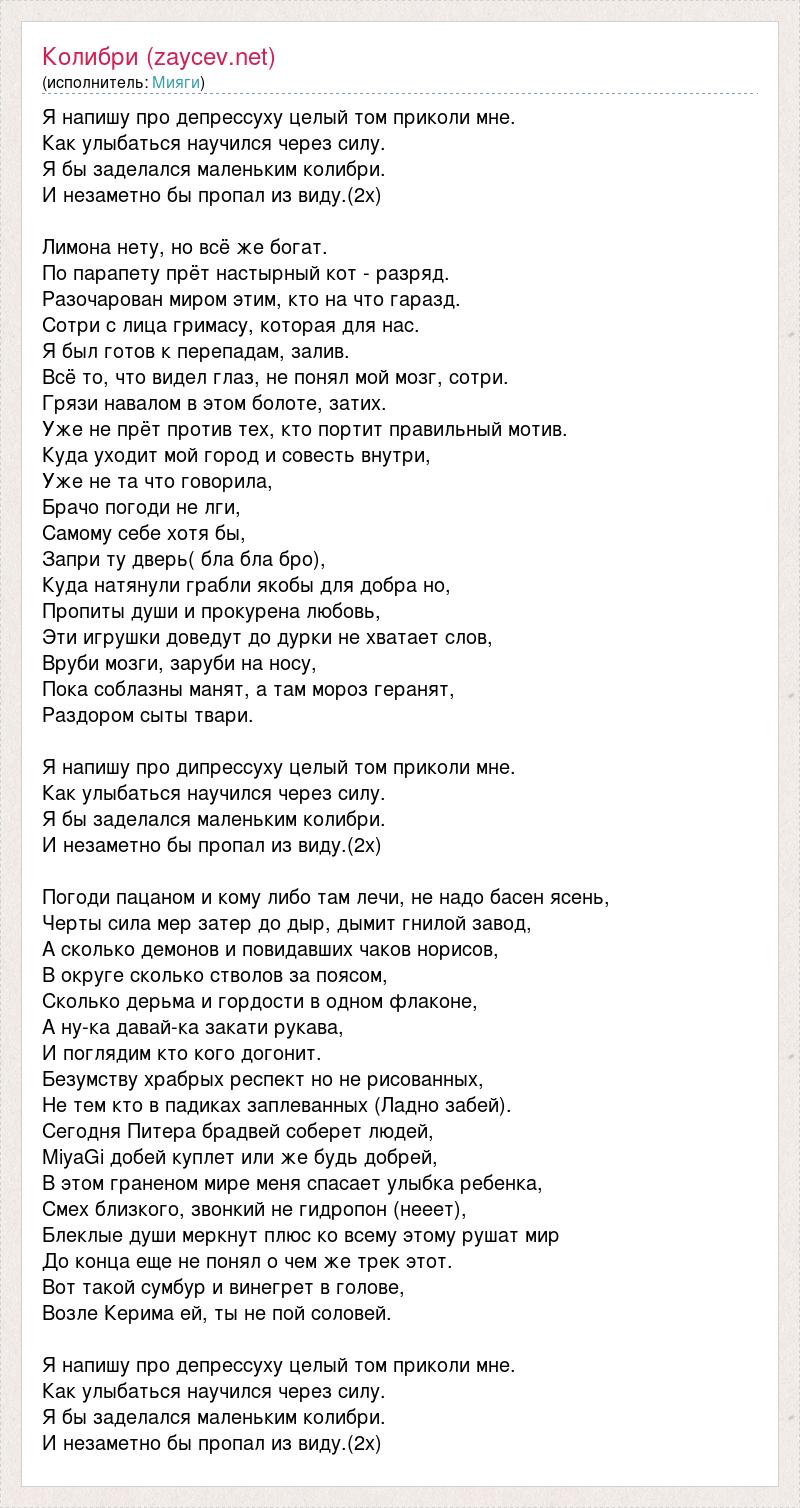 Я напишу про депрессуху целый том приколи мне. Как улыбаться научился через силу. Я бы заделался маленьким колибри. И незаметно бы пропал из виду.(2х) Лимона нету, но всё же богат. По парапету прёт настырный кот - разряд. Разочарован миром этим, кто на что гаразд. Сотри с лица гримасу, которая для нас. Я был готов к перепадам, залив. Всё то, что видел глаз, не понял мой мозг, сотри. Грязи навалом в этом болоте, затих. Уже не прёт против тех, кто портит правильный мотив. Куда уходит мой город и совесть внутри, Уже не та что говорила, Брачо погоди не лги, Самому себе хотя бы, Запри ту дверь( бла бла бро), Куда натянули грабли якобы для добра но, Пропиты души и прокурена любовь, Эти игрушки доведут до дурки не хватает слов, Вруби мозги, заруби на носу, Пока соблазны манят, а там мороз геранят, Раздором сыты твари. Я напишу про дипрессуху целый том приколи мне. Как улыбаться научился через силу. Я бы заделался маленьким колибри. И незаметно бы пропал из виду.(2х) Погоди пацаном и кому либо там лечи, не надо басен ясень, Черты сила мер затер до дыр, дымит гнилой завод, А сколько демонов и повидавших чаков норисов, В округе сколько стволов за поясом, Сколько дерьма и гордости в одном флаконе, А ну-ка давай-ка закати рукава, И поглядим кто кого догонит. Безумству храбрых респект но не рисованных, Не тем кто в падиках заплеванных (Ладно забей). Сегодня Питера брадвей соберет людей, MiyaGi добей куплет или же будь добрей, В этом граненом мире меня спасает улыбка ребенка, Смех близкого, звонкий не гидропон (нееет), Блеклые души меркнут плюс ко всему этому рушат мир До конца еще не понял о чем же трек этот. Вот такой сумбур и винегрет в голове, Возле Керима ей, ты не пой соловей. Я напишу про депрессуху целый том приколи мне. Как улыбаться научился через силу. Я бы заделался маленьким колибри. И незаметно бы пропал из виду.(2х)