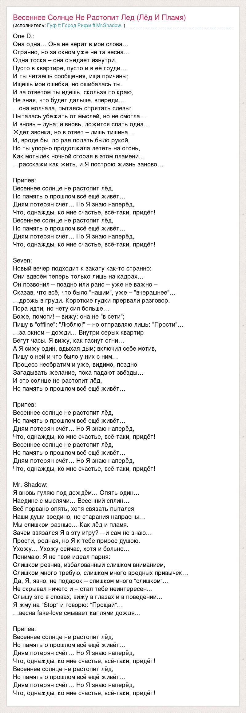 One D.: Она одна… Она не верит в мои слова… Странно, но за окном уже не та весна… Одна тоска – она съедает изнутри. Пусто в квартире, пусто и в её груди… И ты читаешь сообщения, ища причины; Ищешь мои ошибки, но ошибалась ты. И за ответом ты идёшь, скользя по краю, Не зная, что будет дальше, впереди… …она молчала, пытаясь спрятать слёзы; Пыталась убежать от мыслей, но не смогла… И вновь – луна; и вновь, ложится спать одна… Ждёт звонка, но в ответ – лишь тишина… И, вроде бы, до рая подать было рукой, Но ты упорно продолжала лететь на огонь, Как мотылёк ночной сгорая в этом пламени… …расскажи как жить, и Я построю жизнь заново… Припев: Весеннее солнце не растопит лёд, Но память о прошлом всё ещё живёт… Дням потерян счёт… Но Я знаю наперёд, Что, однажды, ко мне счастье, всё-таки, придёт! Весеннее солнце не растопит лёд, Но память о прошлом всё ещё живёт… Дням потерян счёт… Но Я знаю наперёд, Что, однажды, ко мне счастье, всё-таки, придёт! Seven: Новый вечер подходит к закату как-то странно: Они вдвоём теперь только лишь на кадрах… Он позвонил – поздно или рано – уже не важно – Сказав, что всё, что было "нашим", уже – "вчерашнее"… …дрожь в груди. Короткие гудки прервали разговор. Пора идти, но нету сил больше… Боже, помоги! – вижу: она не "в сети"; Пишу в "offline": "Люблю!" – но отправляю лишь: "Прости"… …за окном – дожди… Внутри серых квартир Бегут часы. Я вижу, как гаснут огни… А Я сижу один, вдыхая дым; включил себе мотив, Пишу о ней и что было у них с ним… Процесс необратим и уже, видимо, поздно Загадывать желание, пока падают звёзды… И это солнце не растопит лёд, Но память о прошлом всё ещё живёт… Припев: Весеннее солнце не растопит лёд, Но память о прошлом всё ещё живёт… Дням потерян счёт… Но Я знаю наперёд, Что, однажды, ко мне счастье, всё-таки, придёт! Весеннее солнце не растопит лёд, Но память о прошлом всё ещё живёт… Дням потерян счёт… Но Я знаю наперёд, Что, однажды, ко мне счастье, всё-таки, придёт! Mr. Shadow: Я вновь гуляю под дождём… Опять один… Наедине с мыслями… Весенний сплин… Всё порвано опять, хотя связать пытался Наши души воедино, но старания напрасны… Мы слишком разные… Как лёд и пламя. Зачем ввязался Я в эту игру? – и сам не знаю… Прости, родная, но Я к тебе прирос душою. Ухожу… Ухожу сейчас, хотя и больно… Понимаю: Я не твой идеал парня: Слишком ревнив, избалованный слишком вниманием, Слишком много требую, слишком много вредных привычек… Да, Я, явно, не подарок – слишком много "слишком"… Не скрывал ничего и – стал тебе неинтересен… Слышу это в словах, вижу в глазах и в поведении… Я жму на "Stop" и говорю: "Прощай"… …весна fake-love смывает каплями дождя… Припев: Весеннее солнце не растопит лёд, Но память о прошлом всё ещё живёт… Дням потерян счёт… Но Я знаю наперёд, Что, однажды, ко мне счастье, всё-таки, придёт! Весеннее солнце не растопит лёд, Но память о прошлом всё ещё живёт… Дням потерян счёт… Но Я знаю наперёд, Что, однажды, ко мне счастье, всё-таки, придёт!