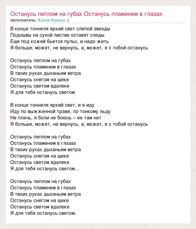 В конце тоннеля яркий свет слепой звезды Подошвы на сухой листве оставят следы Еще под кожей бьется пульс, и надо жить Я больше, может, не вернусь, а, может, я с тобой останусь Останусь пеплом на губах Останусь пламенем в глазах В твоих руках дыханьем ветра Останусь снегом на щеке Останусь светом вдалеке Я для тебя останусь светом В конце тоннеля яркий свет, и я иду Иду по выжженной траве, по тонкому льду Не плачь, я боли не боюсь – ее там нет Я больше, может, не вернусь, а, может, я с тобой останусь Останусь пеплом на губах Останусь пламенем в глазах В твоих руках дыханьем ветра Останусь снегом на щеке Останусь светом вдалеке Я для тебя останусь светом... Останусь пеплом на губах Останусь пламенем в глазах В твоих руках дыханьем ветра Останусь снегом на щеке Останусь светом вдалеке Я для тебя останусь светом.