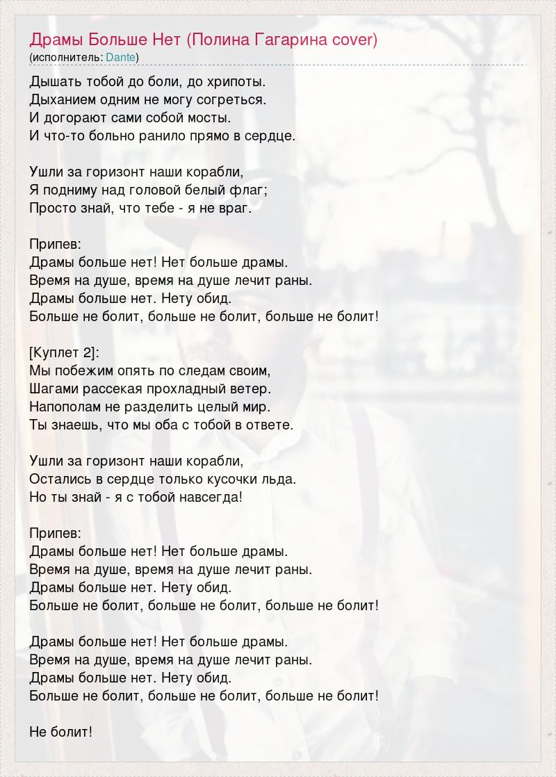 Дышать тобой до боли, до хрипоты. Дыханием одним не могу согреться. И догорают сами собой мосты. И что-то больно ранило прямо в сердце. Ушли за горизонт наши корабли, Я подниму над головой белый флаг; Просто знай, что тебе - я не враг. Припев: Драмы больше нет! Нет больше драмы. Время на душе, время на душе лечит раны. Драмы больше нет. Нету обид. Больше не болит, больше не болит, больше не болит! [Куплет 2]: Мы побежим опять по следам своим, Шагами рассекая прохладный ветер. Напополам не разделить целый мир. Ты знаешь, что мы оба с тобой в ответе. Ушли за горизонт наши корабли, Остались в сердце только кусочки льда. Но ты знай - я с тобой навсегда! Припев: Драмы больше нет! Нет больше драмы. Время на душе, время на душе лечит раны. Драмы больше нет. Нету обид. Больше не болит, больше не болит, больше не болит! Драмы больше нет! Нет больше драмы. Время на душе, время на душе лечит раны. Драмы больше нет. Нету обид. Больше не болит, больше не болит, больше не болит! Не болит!