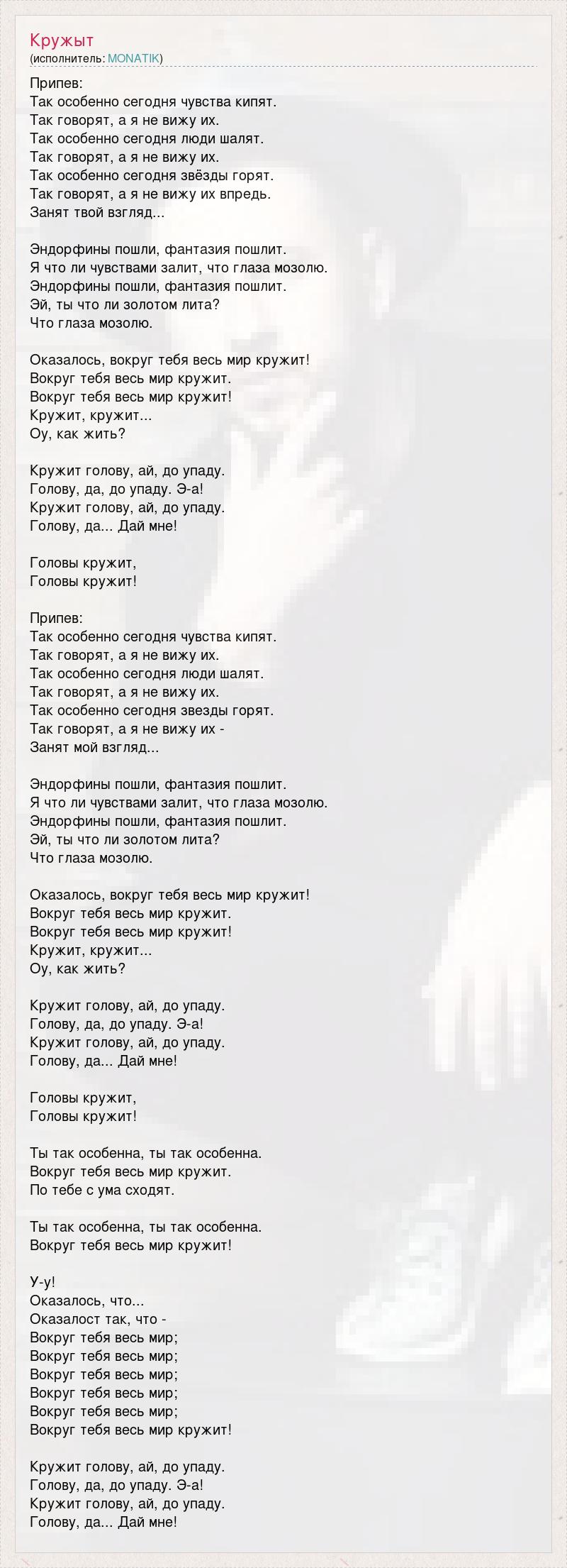 Припев: Так особенно сегодня чувства кипят. Так говорят, а я не вижу их. Так особенно сегодня люди шалят. Так говорят, а я не вижу их. Так особенно сегодня звёзды горят. Так говорят, а я не вижу их впредь. Занят твой взгляд... Эндорфины пошли, фантазия пошлит. Я что ли чувствами залит, что глаза мозолю. Эндорфины пошли, фантазия пошлит. Эй, ты что ли золотом лита? Что глаза мозолю. Оказалось, вокруг тебя весь мир кружит! Вокруг тебя весь мир кружит. Вокруг тебя весь мир кружит! Кружит, кружит... Оу, как жить? Кружит голову, ай, до упаду. Голову, да, до упаду. Э-а! Кружит голову, ай, до упаду. Голову, да... Дай мне! Головы кружит, Головы кружит! Припев: Так особенно сегодня чувства кипят. Так говорят, а я не вижу их. Так особенно сегодня люди шалят. Так говорят, а я не вижу их. Так особенно сегодня звезды горят. Так говорят, а я не вижу их - Занят мой взгляд... Эндорфины пошли, фантазия пошлит. Я что ли чувствами залит, что глаза мозолю. Эндорфины пошли, фантазия пошлит. Эй, ты что ли золотом лита? Что глаза мозолю. Оказалось, вокруг тебя весь мир кружит! Вокруг тебя весь мир кружит. Вокруг тебя весь мир кружит! Кружит, кружит... Оу, как жить? Кружит голову, ай, до упаду. Голову, да, до упаду. Э-а! Кружит голову, ай, до упаду. Голову, да... Дай мне! Головы кружит, Головы кружит! Ты так особенна, ты так особенна. Вокруг тебя весь мир кружит. По тебе с ума сходят. Ты так особенна, ты так особенна. Вокруг тебя весь мир кружит! У-у! Оказалось, что... Оказалост так, что - Вокруг тебя весь мир; Вокруг тебя весь мир; Вокруг тебя весь мир; Вокруг тебя весь мир; Вокруг тебя весь мир; Вокруг тебя весь мир кружит! Кружит голову, ай, до упаду. Голову, да, до упаду. Э-а! Кружит голову, ай, до упаду. Голову, да... Дай мне!