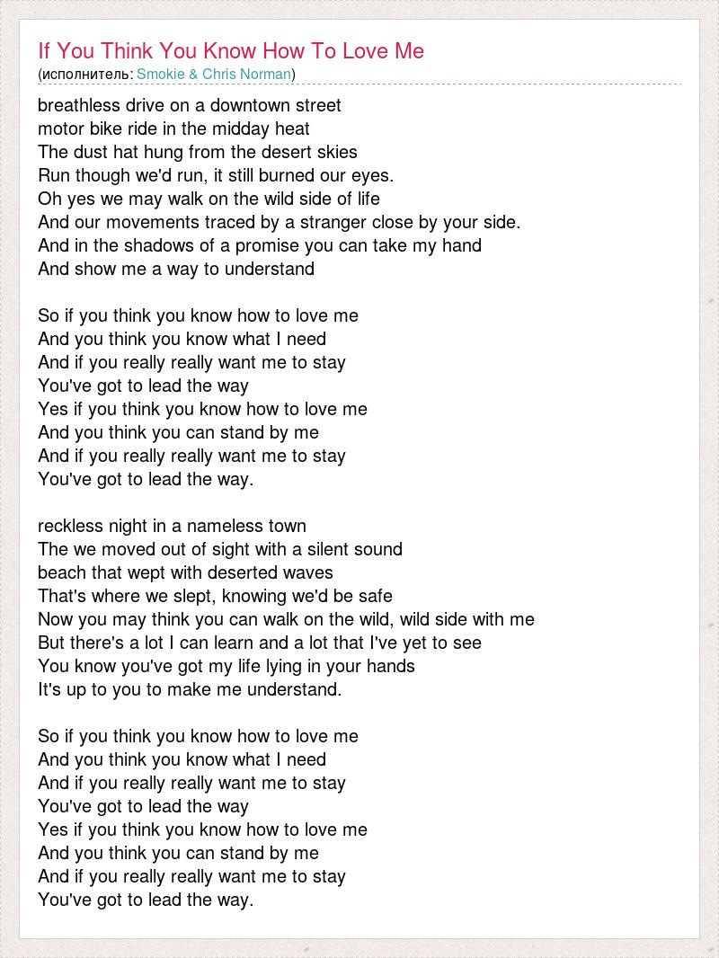 breathless drive on a downtown street motor bike ride in the midday heat The dust hat hung from the desert skies Run though we'd run, it still burned our eyes. Oh yes we may walk on the wild side of life And our movements traced by a stranger close by your side. And in the shadows of a promise you can take my hand And show me a way to understand So if you think you know how to love me And you think you know what I need And if you really really want me to stay You've got to lead the way Yes if you think you know how to love me And you think you can stand by me And if you really really want me to stay You've got to lead the way. reckless night in a nameless town The we moved out of sight with a silent sound beach that wept with deserted waves That's where we slept, knowing we'd be safe Now you may think you can walk on the wild, wild side with me But there's a lot I can learn and a lot that I've yet to see You know you've got my life lying in your hands It's up to you to make me understand. So if you think you know how to love me And you think you know what I need And if you really really want me to stay You've got to lead the way Yes if you think you know how to love me And you think you can stand by me And if you really really want me to stay You've got to lead the way.