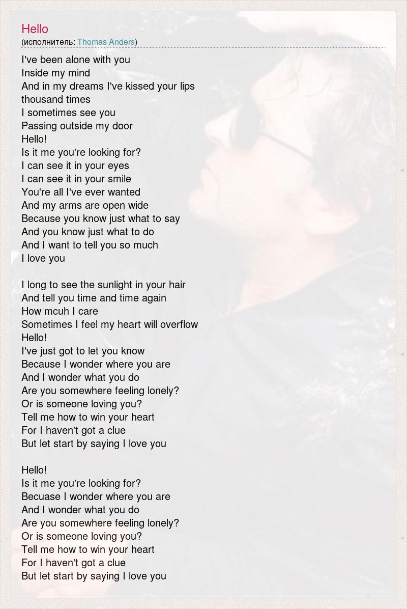 I've been alone with you Inside my mind And in my dreams I've kissed your lips thousand times I sometimes see you Passing outside my door Hello! Is it me you're looking for? I can see it in your eyes I can see it in your smile You're all I've ever wanted And my arms are open wide Because you know just what to say And you know just what to do And I want to tell you so much I love you I long to see the sunlight in your hair And tell you time and time again How mcuh I care Sometimes I feel my heart will overflow Hello! I've just got to let you know Because I wonder where you are And I wonder what you do Are you somewhere feeling lonely? Or is someone loving you? Tell me how to win your heart For I haven't got a clue But let start by saying I love you Hello! Is it me you're looking for? Becuase I wonder where you are And I wonder what you do Are you somewhere feeling lonely? Or is someone loving you? Tell me how to win your heart For I haven't got a clue But let start by saying I love you