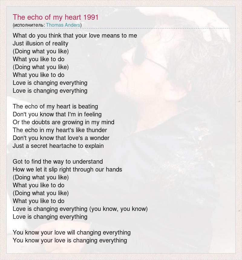 What do you think that your love means to me Just illusion of reality (Doing what you like) What you like to do (Doing what you like) What you like to do Love is changing everything Love is changing everything The echo of my heart is beating Don't you know that I'm in feeling Or the doubts are growing in my mind The echo in my heart's like thunder Don't you know that love's a wonder Just a secret heartache to explain Got to find the way to understand How we let it slip right through our hands (Doing what you like) What you like to do (Doing what you like) What you like to do Love is changing everything (you know, you know) Love is changing everything You know your love will changing everything You know your love is changing everything