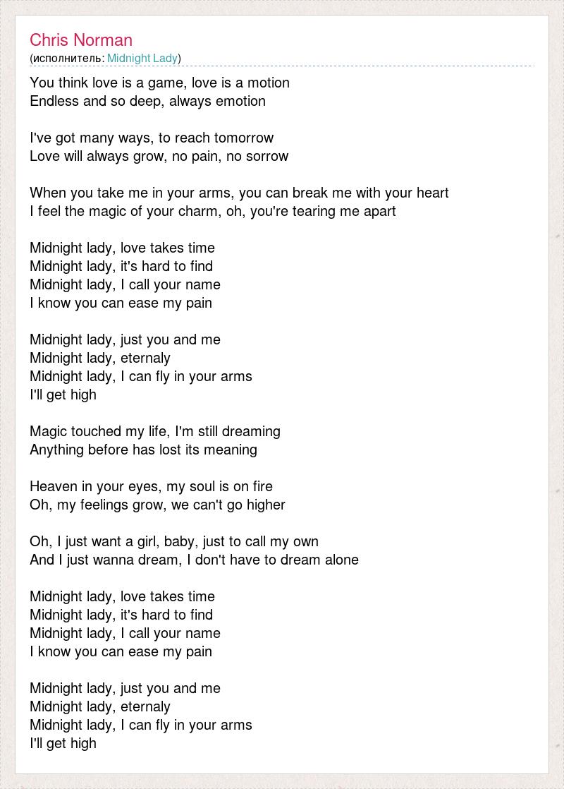 You think love is a game, love is a motion Endless and so deep, always emotion I've got many ways, to reach tomorrow Love will always grow, no pain, no sorrow When you take me in your arms, you can break me with your heart I feel the magic of your charm, oh, you're tearing me apart Midnight lady, love takes time Midnight lady, it's hard to find Midnight lady, I call your name I know you can ease my pain Midnight lady, just you and me Midnight lady, eternaly Midnight lady, I can fly in your arms I'll get high Magic touched my life, I'm still dreaming Anything before has lost its meaning Heaven in your eyes, my soul is on fire Oh, my feelings grow, we can't go higher Oh, I just want a girl, baby, just to call my own And I just wanna dream, I don't have to dream alone Midnight lady, love takes time Midnight lady, it's hard to find Midnight lady, I call your name I know you can ease my pain Midnight lady, just you and me Midnight lady, eternaly Midnight lady, I can fly in your arms I'll get high