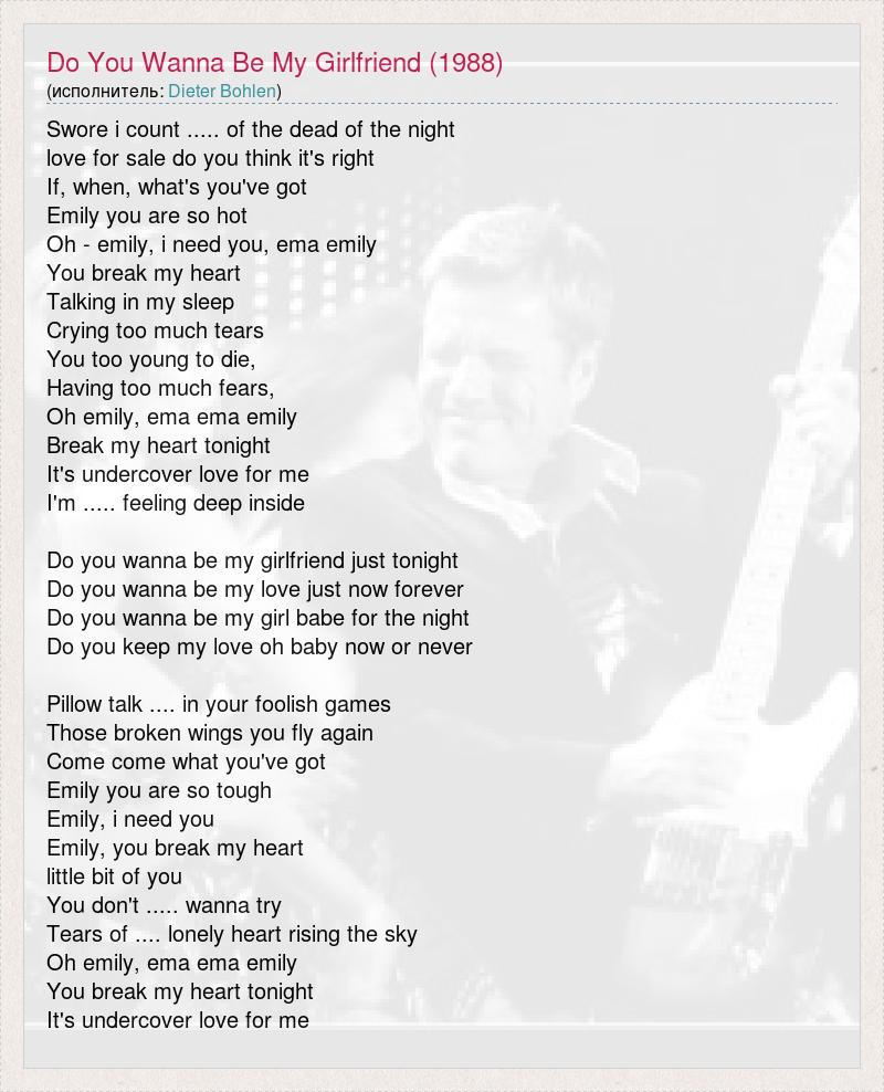 Swore i count ..... of the dead of the night love for sale do you think it's right If, when, what's you've got Emily you are so hot Oh - emily, i need you, ema emily You break my heart Talking in my sleep Crying too much tears You too young to die, Having too much fears, Oh emily, ema ema emily Break my heart tonight It's undercover love for me I'm ..... feeling deep inside Do you wanna be my girlfriend just tonight Do you wanna be my love just now forever Do you wanna be my girl babe for the night Do you keep my love oh baby now or never Pillow talk .... in your foolish games Those broken wings you fly again Come come what you've got Emily you are so tough Emily, i need you Emily, you break my heart little bit of you You don't ..... wanna try Tears of .... lonely heart rising the sky Oh emily, ema ema emily You break my heart tonight It's undercover love for me