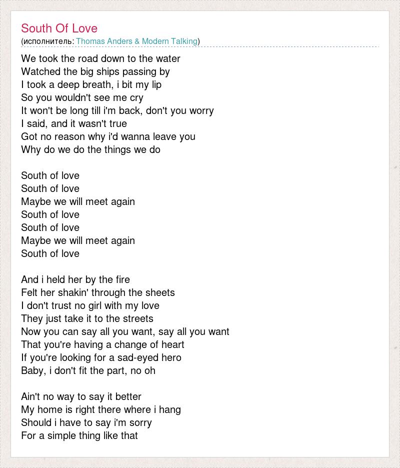 We took the road down to the water Watched the big ships passing by I took a deep breath, i bit my lip So you wouldn't see me cry It won't be long till i'm back, don't you worry I said, and it wasn't true Got no reason why i'd wanna leave you Why do we do the things we do South of love South of love Maybe we will meet again South of love South of love Maybe we will meet again South of love And i held her by the fire Felt her shakin' through the sheets I don't trust no girl with my love They just take it to the streets Now you can say all you want, say all you want That you're having a change of heart If you're looking for a sad-eyed hero Baby, i don't fit the part, no oh Ain't no way to say it better My home is right there where i hang Should i have to say i'm sorry For a simple thing like that