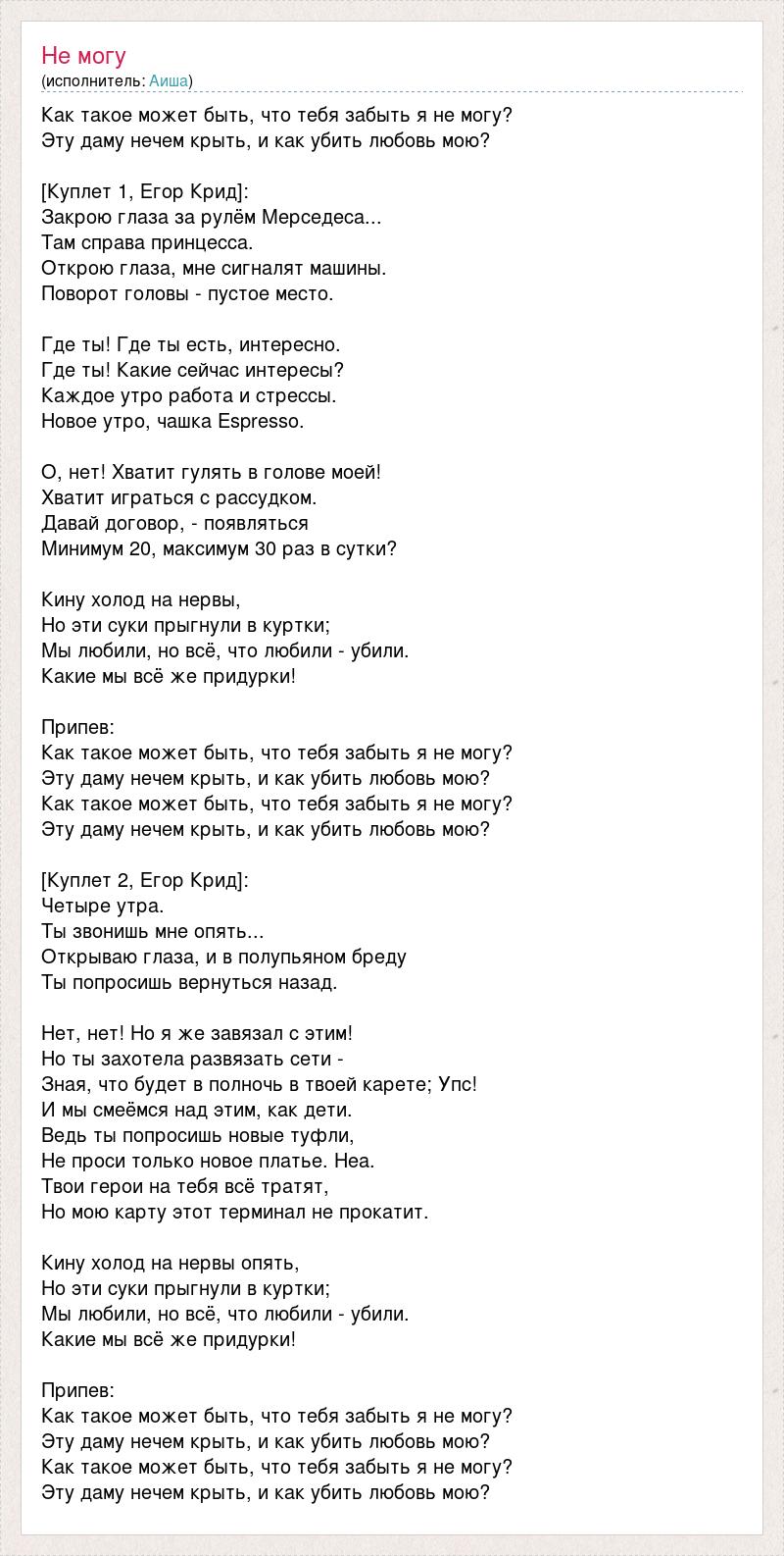 Как такое может быть, что тебя забыть я не могу? Эту даму нечем крыть, и как убить любовь мою? [Куплет 1, Егор Крид]: Закрою глаза за рулём Мерседеса... Там справа принцесса. Открою глаза, мне сигналят машины. Поворот головы - пустое место. Где ты! Где ты есть, интересно. Где ты! Какие сейчас интересы? Каждое утро работа и стрессы. Новое утро, чашка Espresso. О, нет! Хватит гулять в голове моей! Хватит играться с рассудком. Давай договор, - появляться Минимум 20, максимум 30 раз в сутки? Кину холод на нервы, Но эти суки прыгнули в куртки; Мы любили, но всё, что любили - убили. Какие мы всё же придурки! Припев: Как такое может быть, что тебя забыть я не могу? Эту даму нечем крыть, и как убить любовь мою? Как такое может быть, что тебя забыть я не могу? Эту даму нечем крыть, и как убить любовь мою? [Куплет 2, Егор Крид]: Четыре утра. Ты звонишь мне опять... Открываю глаза, и в полупьяном бреду Ты попросишь вернуться назад. Нет, нет! Но я же завязал с этим! Но ты захотела развязать сети - Зная, что будет в полночь в твоей карете; Упс! И мы смеёмся над этим, как дети. Ведь ты попросишь новые туфли, Не проси только новое платье. Неа. Твои герои на тебя всё тратят, Но мою карту этот терминал не прокатит. Кину холод на нервы опять, Но эти суки прыгнули в куртки; Мы любили, но всё, что любили - убили. Какие мы всё же придурки! Припев: Как такое может быть, что тебя забыть я не могу? Эту даму нечем крыть, и как убить любовь мою? Как такое может быть, что тебя забыть я не могу? Эту даму нечем крыть, и как убить любовь мою?