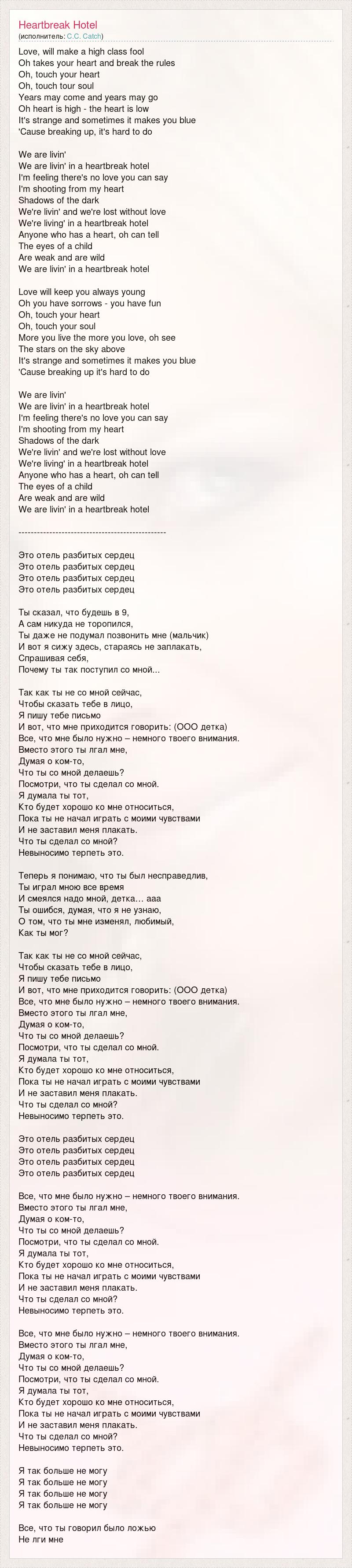 Love, will make a high class fool Oh takes your heart and break the rules Oh, touch your heart Oh, touch tour soul Years may come and years may go Oh heart is high - the heart is low It's strange and sometimes it makes you blue 'Cause breaking up, it's hard to do We are livin' We are livin' in a heartbreak hotel I'm feeling there's no love you can say I'm shooting from my heart Shadows of the dark We're livin' and we're lost without love We're living' in a heartbreak hotel Anyone who has a heart, oh can tell The eyes of a child Are weak and are wild We are livin' in a heartbreak hotel Love will keep you always young Oh you have sorrows - you have fun Oh, touch your heart Oh, touch your soul More you live the more you love, oh see The stars on the sky above It's strange and sometimes it makes you blue 'Cause breaking up it's hard to do We are livin' We are livin' in a heartbreak hotel I'm feeling there's no love you can say I'm shooting from my heart Shadows of the dark We're livin' and we're lost without love We're living' in a heartbreak hotel Anyone who has a heart, oh can tell The eyes of a child Are weak and are wild We are livin' in a heartbreak hotel ------------------------------------------------ Это отель разбитых сердец Это отель разбитых сердец Это отель разбитых сердец Это отель разбитых сердец Ты сказал, что будешь в 9, А сам никуда не торопился, Ты даже не подумал позвонить мне (мальчик) И вот я сижу здесь, стараясь не заплакать, Спрашивая себя, Почему ты так поступил со мной... Так как ты не со мной сейчас, Чтобы сказать тебе в лицо, Я пишу тебе письмо И вот, что мне приходится говорить: (ООО детка) Все, что мне было нужно – немного твоего внимания. Вместо этого ты лгал мне, Думая о ком-то, Что ты со мной делаешь? Посмотри, что ты сделал со мной. Я думала ты тот, Кто будет хорошо ко мне относиться, Пока ты не начал играть с моими чувствами И не заставил меня плакать. Что ты сделал со мной? Невыносимо терпеть это. Теперь я понимаю, что ты был несправедлив, Ты играл мною все время И смеялся надо мной, детка… ааа Ты ошибся, думая, что я не узнаю, О том, что ты мне изменял, любимый, Как ты мог? Так как ты не со мной сейчас, Чтобы сказать тебе в лицо, Я пишу тебе письмо И вот, что мне приходится говорить: (ООО детка) Все, что мне было нужно – немного твоего внимания. Вместо этого ты лгал мне, Думая о ком-то, Что ты со мной делаешь? Посмотри, что ты сделал со мной. Я думала ты тот, Кто будет хорошо ко мне относиться, Пока ты не начал играть с моими чувствами И не заставил меня плакать. Что ты сделал со мной? Невыносимо терпеть это. Это отель разбитых сердец Это отель разбитых сердец Это отель разбитых сердец Это отель разбитых сердец Все, что мне было нужно – немного твоего внимания. Вместо этого ты лгал мне, Думая о ком-то, Что ты со мной делаешь? Посмотри, что ты сделал со мной. Я думала ты тот, Кто будет хорошо ко мне относиться, Пока ты не начал играть с моими чувствами И не заставил меня плакать. Что ты сделал со мной? Невыносимо терпеть это. Все, что мне было нужно – немного твоего внимания. Вместо этого ты лгал мне, Думая о ком-то, Что ты со мной делаешь? Посмотри, что ты сделал со мной. Я думала ты тот, Кто будет хорошо ко мне относиться, Пока ты не начал играть с моими чувствами И не заставил меня плакать. Что ты сделал со мной? Невыносимо терпеть это. Я так больше не могу Я так больше не могу Я так больше не могу Я так больше не могу Все, что ты говорил было ложью Не лги мне