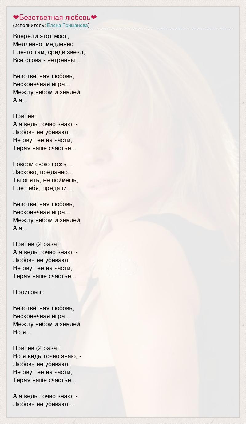 Впереди этот мост, Медленно, медленно Где-то там, среди звезд, Все слова - ветренны... Безответная любовь, Бесконечная игра... Между небом и землей, А я... Припев: А я ведь точно знаю, - Любовь не убивают, Не рвут ее на части, Теряя наше счастье... Говори свою ложь... Ласково, преданно... Ты опять, не поймешь, Где тебя, предали... Безответная любовь, Бесконечная игра... Между небом и землей, А я... Припев (2 раза): А я ведь точно знаю, - Любовь не убивают, Не рвут ее на части, Теряя наше счастье... Проигрыш: Безответная любовь, Бесконечная игра... Между небом и землей, Но я... Припев (2 раза): Но я ведь точно знаю, - Любовь не убивают, Не рвут ее на части, Теряя наше счастье... А я ведь точно знаю, - Любовь не убивают...