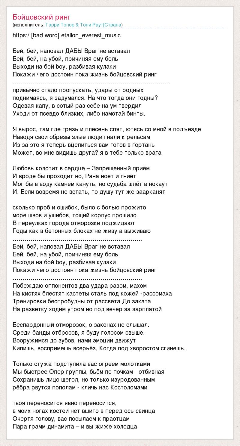 https:/ [bad word] etallon_everest_music Бей, бей, наповал ДАБЫ Враг не вставал Бей, бей, на убой, причиняя ему боль Выходи на бой boy, разбивая кулаки Покажи чего достоин пока жизнь бойцовский ринг ……………………………………………………………………. привычно стало пропускать, удары от родных поднимаясь, я задумался. На что тогда они годны? Одевая капу, в сотый раз себе на ум твердил Уходи от псевдо близких, либо намотай бинты. Я вырос, там где грязь и плесень спят, ютясь со мной в подъезде Наводя свои обрезы злые люди гнали к рельсам Из за это я теперь вцепиться вам готов в гортань Может, во мне видишь друга? я в тебе только врага Любовь колотит в сердце – Запрещенный приём И вроде бы проходит но, Рана ноет и гниёт Мог бы в воду камнем кануть, но судьба шлёт в нокаут И. Если вовремя не встать, то душу тут же заарканят сколько проб и ошибок, было с болью прожито море швов и ушибов, тощий корпус прошило. В переулках города отморозки поджидают Годы как в бетонных блоках не живу а выживаю ……………………………………………………….. Бей, бей, наповал ДАБЫ Враг не вставал Бей, бей, на убой, причиняя ему боль Выходи на бой boy, разбивая кулаки Покажи чего достоин пока жизнь бойцовский ринг ……………………………………………………….. Побеждаю оппонентов два удара разом, махом На кистях блестят кастеты сталь под кожей -рассомаха Тренировки беспробудны от рассвета До заката На разветку ходим утром но под вечер за зарплатой Беспардонный отморозок, о законах не слышал. Среди банды отбросов, я буду голосом свыше. Вооружимся до зубов, нами эмоции движут Кипишь, воспримешь всерьёз, Когда под хворостом сгинешь. Только стужа подступила вас огреем молотками Мы быстрее Опер группы, бьём по почкам - отбивная Сохранишь лицо щегол, но только изуродованным рёбра рвутся пополам - кличь нас Костоломами твоя переносится явно переносится, в моих ногах костей нет вшито в перед ось свинца Очертя голову, вас посылаем к праотцам Пара грамм динамита – и вы жиже холодца
