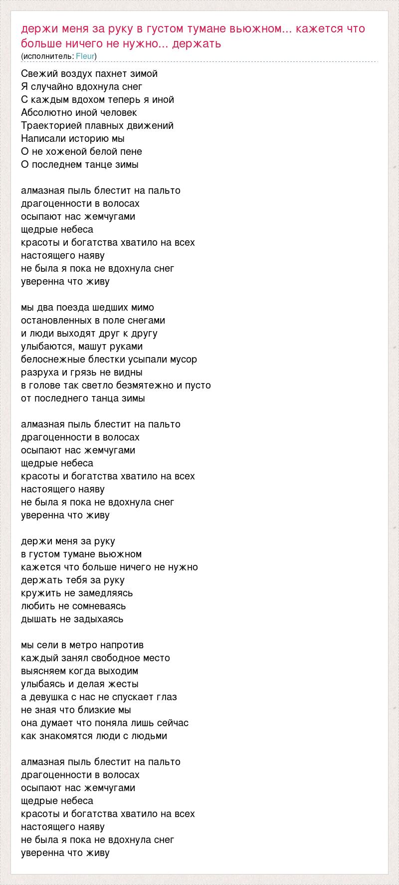 Свежий воздух пахнет зимой Я случайно вдохнула снег С каждым вдохом теперь я иной Абсолютно иной человек Траекторией плавных движений Написали историю мы О не хоженой белой пене О последнем танце зимы алмазная пыль блестит на пальто драгоценности в волосах осыпают нас жемчугами щедрые небеса красоты и богатства хватило на всех настоящего наяву не была я пока не вдохнула снег уверенна что живу мы два поезда шедших мимо остановленных в поле снегами и люди выходят друг к другу улыбаются, машут руками белоснежные блестки усыпали мусор разруха и грязь не видны в голове так светло безмятежно и пусто от последнего танца зимы алмазная пыль блестит на пальто драгоценности в волосах осыпают нас жемчугами щедрые небеса красоты и богатства хватило на всех настоящего наяву не была я пока не вдохнула снег уверенна что живу держи меня за руку в густом тумане вьюжном кажется что больше ничего не нужно держать тебя за руку кружить не замедляясь любить не сомневаясь дышать не задыхаясь мы сели в метро напротив каждый занял свободное место выясняем когда выходим улыбаясь и делая жесты а девушка с нас не спускает глаз не зная что близкие мы она думает что поняла лишь сейчас как знакомятся люди с людьми алмазная пыль блестит на пальто драгоценности в волосах осыпают нас жемчугами щедрые небеса красоты и богатства хватило на всех настоящего наяву не была я пока не вдохнула снег уверенна что живу