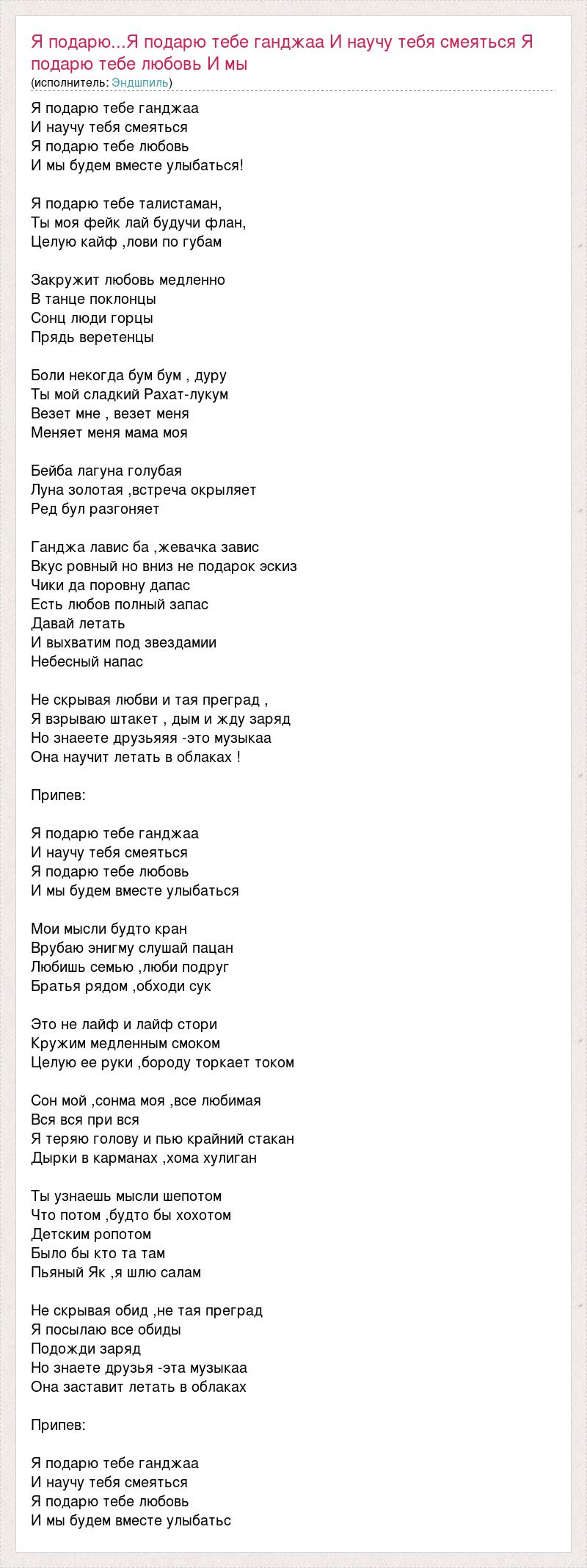 Я подарю тебе ганджаа И научу тебя смеяться Я подарю тебе любовь И мы будем вместе улыбаться! Я подарю тебе талистаман, Ты моя фейк лай будучи флан, Целую кайф ,лови по губам Закружит любовь медленно В танце поклонцы Сонц люди горцы Прядь веретенцы Боли некогда бум бум , дуру Ты мой сладкий Рахат-лукум Везет мне , везет меня Меняет меня мама моя Бейба лагуна голубая Луна золотая ,встреча окрыляет Ред бул разгоняет Ганджа лавис ба ,жевачка завис Вкус ровный но вниз не подарок эскиз Чики да поровну дапас Есть любов полный запас Давай летать И выхватим под звездамии Небесный напас Не скрывая любви и тая преград , Я взрываю штакет , дым и жду заряд Но знаеете друзьяяя -это музыкаа Она научит летать в облаках ! Припев: Я подарю тебе ганджаа И научу тебя смеяться Я подарю тебе любовь И мы будем вместе улыбаться Мои мысли будто кран Врубаю энигму слушай пацан Любишь семью ,люби подруг Братья рядом ,обходи сук Это не лайф и лайф стори Кружим медленным смоком Целую ее руки ,бороду торкает током Сон мой ,сонма моя ,все любимая Вся вся при вся Я теряю голову и пью крайний стакан Дырки в карманах ,хома хулиган Ты узнаешь мысли шепотом Что потом ,будто бы хохотом Детским ропотом Было бы кто та там Пьяный Як ,я шлю салам Не скрывая обид ,не тая преград Я посылаю все обиды Подожди заряд Но знаете друзья -эта музыкаа Она заставит летать в облаках Припев: Я подарю тебе ганджаа И научу тебя смеяться Я подарю тебе любовь И мы будем вместе улыбатьс