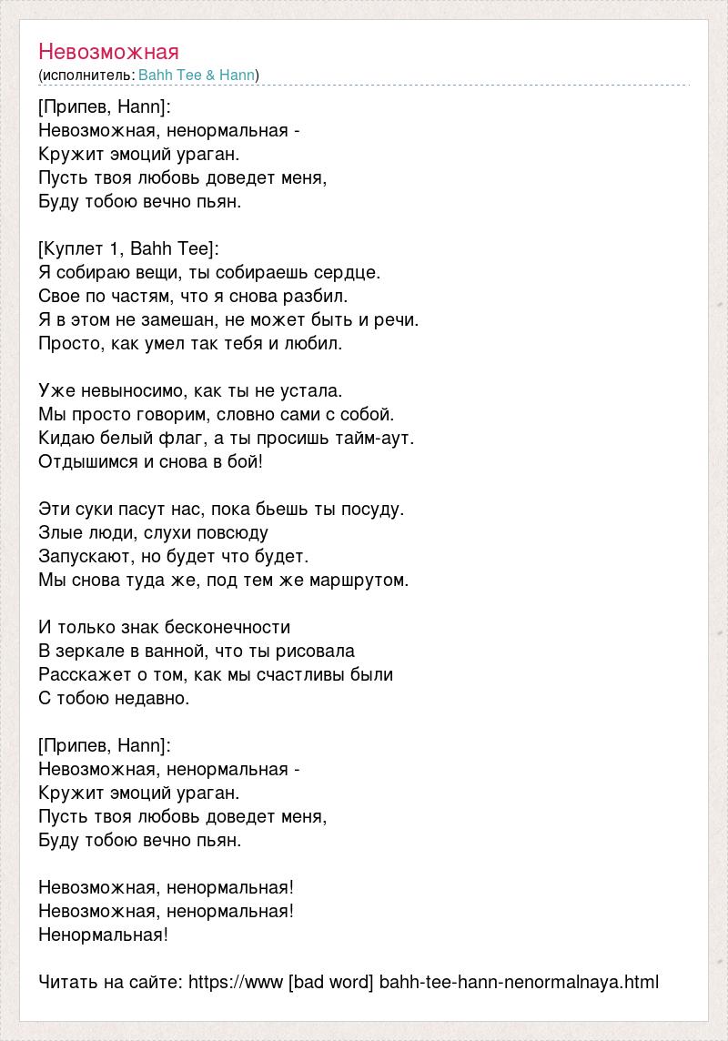 [Припев, Hann]: Невозможная, ненормальная - Кружит эмоций ураган. Пусть твоя любовь доведет меня, Буду тобою вечно пьян. [Куплет 1, Bahh Tee]: Я собираю вещи, ты собираешь сердце. Свое по частям, что я снова разбил. Я в этом не замешан, не может быть и речи. Просто, как умел так тебя и любил. Уже невыносимо, как ты не устала. Мы просто говорим, словно сами с собой. Кидаю белый флаг, а ты просишь тайм-аут. Отдышимся и снова в бой! Эти суки пасут нас, пока бьешь ты посуду. Злые люди, слухи повсюду Запускают, но будет что будет. Мы снова туда же, под тем же маршрутом. И только знак бесконечности В зеркале в ванной, что ты рисовала Расскажет о том, как мы счастливы были С тобою недавно. [Припев, Hann]: Невозможная, ненормальная - Кружит эмоций ураган. Пусть твоя любовь доведет меня, Буду тобою вечно пьян. Невозможная, ненормальная! Невозможная, ненормальная! Ненормальная! Читать на сайте: https://www [bad word] bahh-tee-hann-nenormalnaya.html