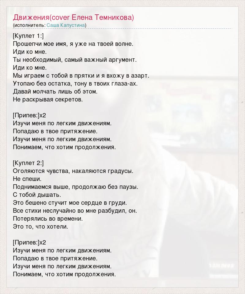 [Куплет 1:] Прошепчи мое имя, я уже на твоей волне. Иди ко мне. Ты необходимый, самый важный аргумент. Иди ко мне. Мы играем с тобой в прятки и я вхожу в азарт. Утопаю без остатка, тону в твоих глаза-ах. Давай молчать лишь об этом. Не раскрывая секретов. [Припев:]х2 Изучи меня по легким движениям. Попадаю в твое притяжение. Изучи меня по легким движениям. Понимаем, что хотим продолжения. [Куплет 2:] Оголяются чувства, накаляются градусы. Не спеши. Поднимаемся выше, продолжаю без паузы. С тобой дышать. Это бешено стучит мое сердце в груди. Все стихи неслучайно во мне разбудил, он. Потерялись во времени. Это то, что хотели. [Припев:]х2 Изучи меня по легким движениям. Попадаю в твое притяжение. Изучи меня по легким движениям. Понимаем, что хотим продолжения.