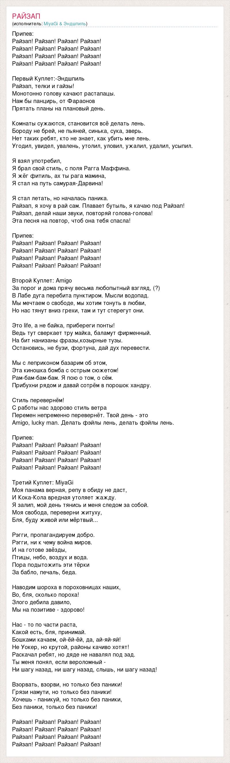 Припев: Райзап! Райзап! Райзап! Райзап! Райзап! Райзап! Райзап! Райзап! Райзап! Райзап! Райзап! Райзап! Райзап! Райзап! Райзап! Райзап! Первый Куплет:-Эндшпиль Райзап, телки и гайзы! Монотонно голову качают растапацы. Нам бы панцирь, от Фараонов Прятать планы на плановый день. Комнаты сужаются, становится всё делать лень. Бороду не брей, не пьяней, синька, сука, зверь. Нет таких ребят, кто не знает, как убить мне лень. Угодил, увидел, увалень, утолил, уловил, ужалил, удалил, усыпил. Я взял употребил, Я брал свой стиль, с поля Рагга Маффина. Я жёг фитиль, ах ты рага мамина, Я стал на путь самурая-Дарвина! Я стал летать, но началась паника. Райзап, я хочу в рай сам. Плавает бутыль, я качаю под Райзап! Райзап, делай наши звуки, повторяй голова-голова! Эта песня на повтор, чтоб она тебя спасла! Припев: Райзап! Райзап! Райзап! Райзап! Райзап! Райзап! Райзап! Райзап! Райзап! Райзап! Райзап! Райзап! Райзап! Райзап! Райзап! Райзап! Второй Куплет: Amigo За порог и дома прячу весьма любопытный взгляд, (?) В Лабе дуга перебита пунктиром. Мысли водопад. Мы мечтаем о свободе, мы хотим тонуть в любви, Но нас тянут вниз грехи, там и тут стерегут они. Это life, а не байка, прибереги понты! Ведь тут сверкает тру майка, баламут фирменный. На бит нанизаны фразы,козырные тузы. Остановись, не бузи, фортуна, дай дух перевести. Мы с леприконом базарим об этом, Эта киношка бомба с острым сюжетом! Рам-бам-бам-бам. Я пою о том, о сём. Прибухни рядом и давай сотрём в порошок хандру. Стиль перевернём! С работы нас здорово стиль ветра Перемен непременно перевернёт. Твой день - это Amigo, lucky man. Делать фэйлы лень, делать фэйлы лень. Припев: Райзап! Райзап! Райзап! Райзап! Райзап! Райзап! Райзап! Райзап! Райзап! Райзап! Райзап! Райзап! Райзап! Райзап! Райзап! Райзап! Третий Куплет: MiyaGi Моя панама верная, репу в обиду не даст, И Кока-Кола вредная утоляет жажду. Я залип, мой день тянись и меня следом за собой. Моя свобода, переверни житуху, Бля, буду живой или мёртвый... Рэгги, пропагандируем добро. Рэгги, ни к чему война миров. И на готове звёзды, Птицы, небо, воздух и вода. Пора подытожить эти тёрки За бабло, печаль, беда. Наводим шороха в пороховницах наших, Во, бля, сколько пороха! Злого дебила давило, Мы на позитиве - здорово! Нас - то по части раста, Какой есть, бля, принимай. Бошками качаем, ой-ёй-ёй, да, ай-яй-яй! Не Уокер, но крутой, районы качиво хотят! Раскачал ребят, но дяде не навалял под зад. Ты меня понял, если вероломный - Ни шагу назад, ни шагу назад, слышь, ни шагу назад! Взорвать, взорви, но только без паники! Грязи намути, но только без паники! Хочешь - паникуй, но только без паники, Без паники, только без паники! Райзап! Райзап! Райзап! Райзап! Райзап! Райзап! Райзап! Райзап! Райзап! Райзап! Райзап! Райзап! Райзап! Райзап! Райзап! Райзап!