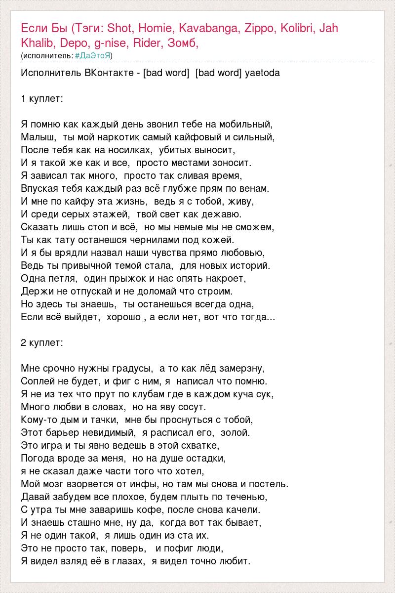 Исполнитель ВКонтакте - [bad word] [bad word] yaetoda 1 куплет: Я помню как каждый день звонил тебе на мобильный, Малыш, ты мой наркотик самый кайфовый и сильный, После тебя как на носилках, убитых выносит, И я такой же как и все, просто местами зоносит. Я зависал так много, просто так сливая время, Впуская тебя каждый раз всё глубже прям по венам. И мне по кайфу эта жизнь, ведь я с тобой, живу, И среди серых этажей, твой свет как дежавю. Сказать лишь стоп и всё, но мы немые мы не сможем, Ты как тату останешся чернилами под кожей. И я бы врядли назвал наши чувства прямо любовью, Ведь ты привычной темой стала, для новых историй. Одна петля, один прыжок и нас опять накроет, Держи не отпускай и не доломай что строим. Но здесь ты знаешь, ты останешься всегда одна, Если всё выйдет, хорошо , а если нет, вот что тогда... 2 куплет: Мне срочно нужны градусы, а то как лёд замерзну, Соплей не будет, и фиг с ним, я написал что помню. Я не из тех что прут по клубам где в каждом куча сук, Много любви в словах, но на яву сосут. Кому-то дым и тачки, мне бы проснуться с тобой, Этот барьер невидимый, я расписал его, золой. Это игра и ты явно ведешь в этой схватке, Погода вроде за меня, но на душе остадки, я не сказал даже части того что хотел, Мой мозг взорвется от инфы, но там мы снова и постель. Давай забудем все плохое, будем плыть по теченью, С утра ты мне заваришь кофе, после снова качели. И знаешь сташно мне, ну да, когда вот так бывает, Я не один такой, я лишь один из ста их. Это не просто так, поверь, и пофиг люди, Я видел взляд её в глазах, я видел точно любит.