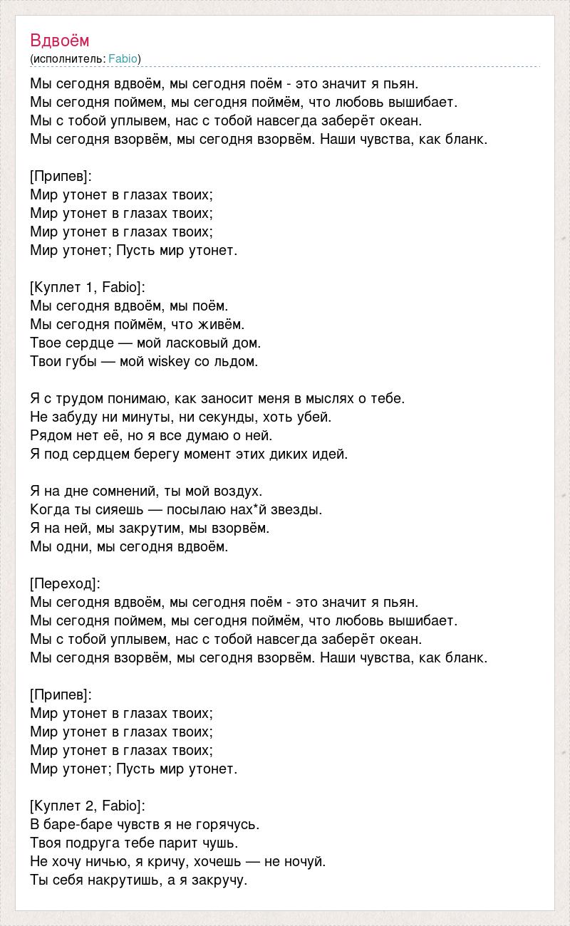 Мы сегодня вдвоём, мы сегодня поём - это значит я пьян. Мы сегодня поймем, мы сегодня поймём, что любовь вышибает. Мы с тобой уплывем, нас с тобой навсегда заберёт океан. Мы сегодня взорвём, мы сегодня взорвём. Наши чувства, как бланк. [Припев]: Мир утонет в глазах твоих; Мир утонет в глазах твоих; Мир утонет в глазах твоих; Мир утонет; Пусть мир утонет. [Куплет 1, Fabio]: Мы сегодня вдвоём, мы поём. Мы сегодня поймём, что живём. Твое сердце — мой ласковый дом. Твои губы — мой wiskey со льдом. Я с трудом понимаю, как заносит меня в мыслях о тебе. Не забуду ни минуты, ни секунды, хоть убей. Рядом нет её, но я все думаю о ней. Я под сердцем берегу момент этих диких идей. Я на дне сомнений, ты мой воздух. Когда ты сияешь — посылаю нах*й звезды. Я на ней, мы закрутим, мы взорвём. Мы одни, мы сегодня вдвоём. [Переход]: Мы сегодня вдвоём, мы сегодня поём - это значит я пьян. Мы сегодня поймем, мы сегодня поймём, что любовь вышибает. Мы с тобой уплывем, нас с тобой навсегда заберёт океан. Мы сегодня взорвём, мы сегодня взорвём. Наши чувства, как бланк. [Припев]: Мир утонет в глазах твоих; Мир утонет в глазах твоих; Мир утонет в глазах твоих; Мир утонет; Пусть мир утонет. [Куплет 2, Fabio]: В баре-баре чувств я не горячусь. Твоя подруга тебе парит чушь. Не хочу ничью, я кричу, хочешь — не ночуй. Ты себя накрутишь, а я закручу.