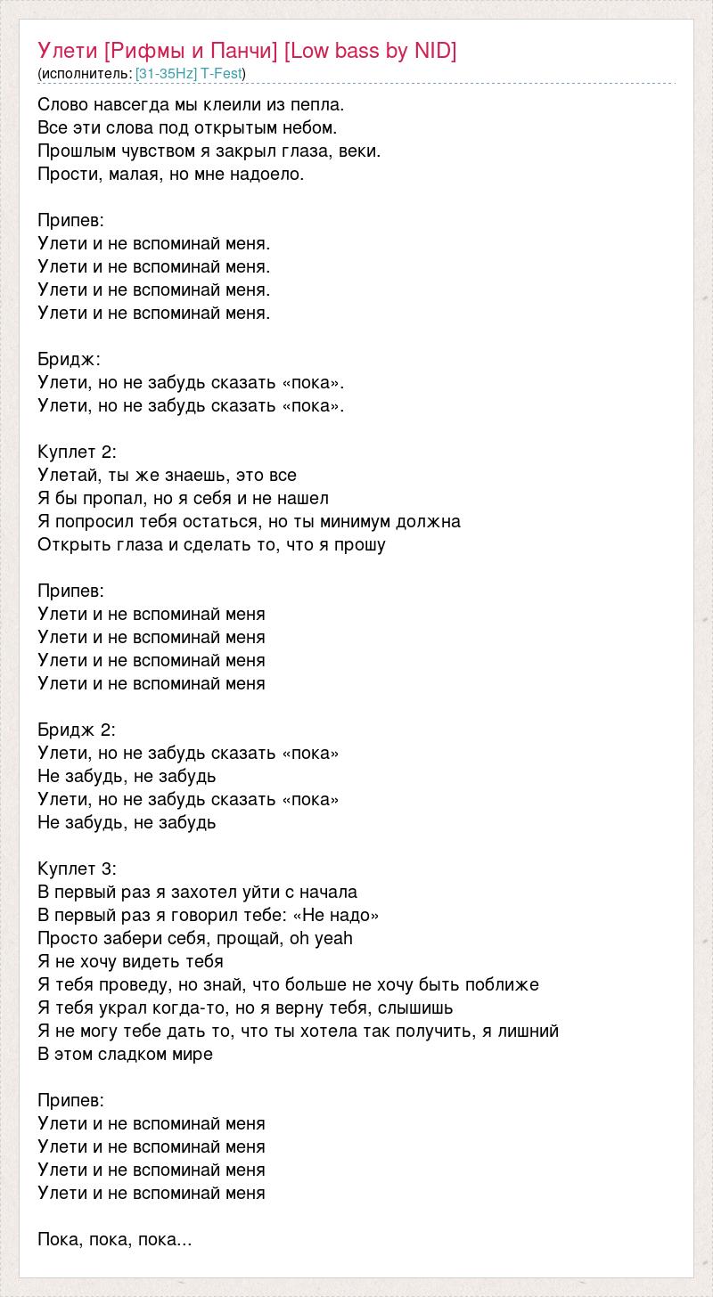 Слово навсегда мы клеили из пепла. Все эти слова под открытым небом. Прошлым чувством я закрыл глаза, веки. Прости, малая, но мне надоело. Припев: Улети и не вспоминай меня. Улети и не вспоминай меня. Улети и не вспоминай меня. Улети и не вспоминай меня. Бридж: Улети, но не забудь сказать «пока». Улети, но не забудь сказать «пока». Куплет 2: Улетай, ты же знаешь, это все Я бы пропал, но я себя и не нашел Я попросил тебя остаться, но ты минимум должна Открыть глаза и сделать то, что я прошу Припев: Улети и не вспоминай меня Улети и не вспоминай меня Улети и не вспоминай меня Улети и не вспоминай меня Бридж 2: Улети, но не забудь сказать «пока» Не забудь, не забудь Улети, но не забудь сказать «пока» Не забудь, не забудь Куплет 3: В первый раз я захотел уйти с начала В первый раз я говорил тебе: «Не надо» Просто забери себя, прощай, oh yeah Я не хочу видеть тебя Я тебя проведу, но знай, что больше не хочу быть поближе Я тебя украл когда-то, но я верну тебя, слышишь Я не могу тебе дать то, что ты хотела так получить, я лишний В этом сладком мире Припев: Улети и не вспоминай меня Улети и не вспоминай меня Улети и не вспоминай меня Улети и не вспоминай меня Пока, пока, пока...