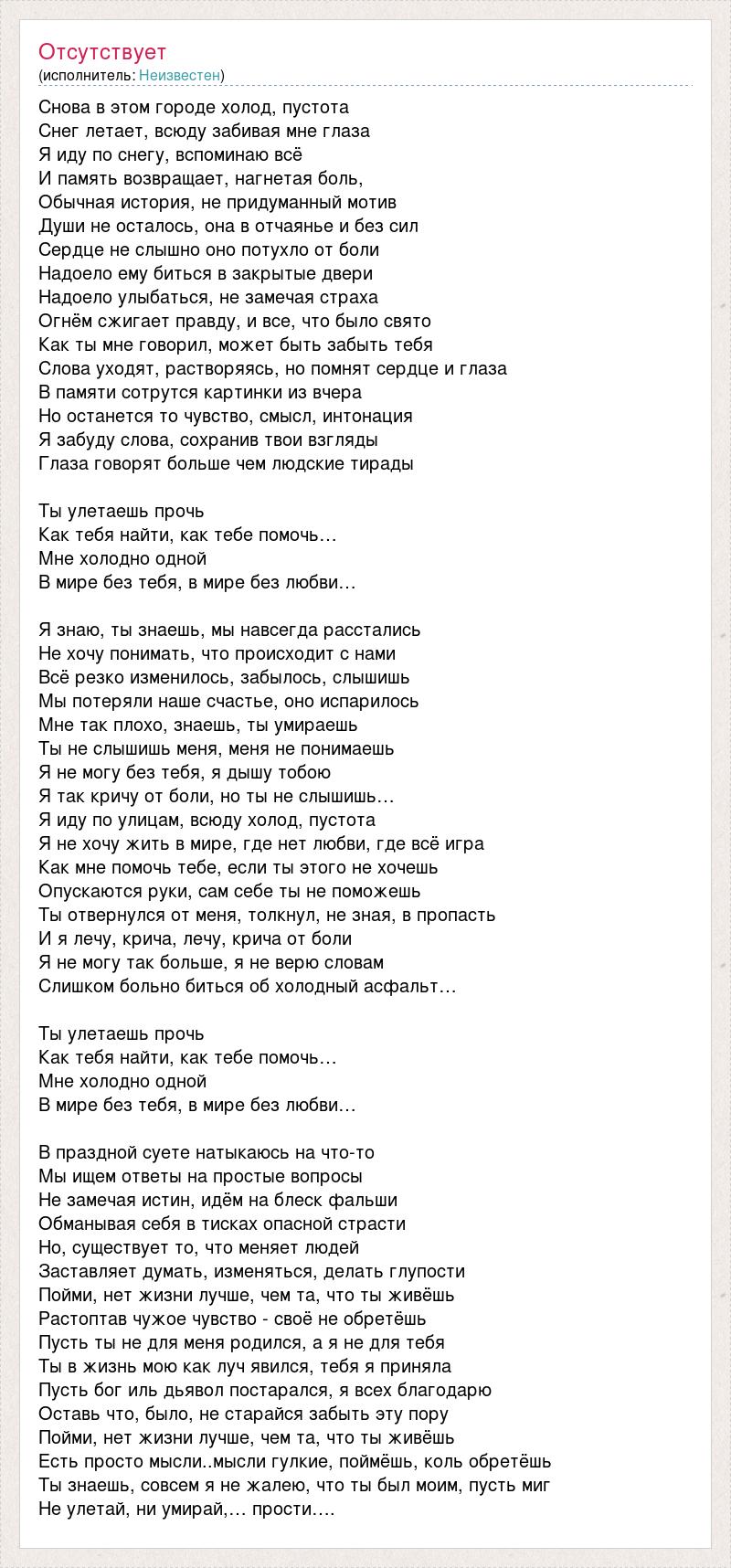 Снова в этом городе холод, пустота Снег летает, всюду забивая мне глаза Я иду по снегу, вспоминаю всё И память возвращает, нагнетая боль, Обычная история, не придуманный мотив Души не осталось, она в отчаянье и без сил Сердце не слышно оно потухло от боли Надоело ему биться в закрытые двери Надоело улыбаться, не замечая страха Огнём сжигает правду, и все, что было свято Как ты мне говорил, может быть забыть тебя Слова уходят, растворяясь, но помнят сердце и глаза В памяти сотрутся картинки из вчера Но останется то чувство, смысл, интонация Я забуду слова, сохранив твои взгляды Глаза говорят больше чем людские тирады Ты улетаешь прочь Как тебя найти, как тебе помочь… Мне холодно одной В мире без тебя, в мире без любви… Я знаю, ты знаешь, мы навсегда расстались Не хочу понимать, что происходит с нами Всё резко изменилось, забылось, слышишь Мы потеряли наше счастье, оно испарилось Мне так плохо, знаешь, ты умираешь Ты не слышишь меня, меня не понимаешь Я не могу без тебя, я дышу тобою Я так кричу от боли, но ты не слышишь… Я иду по улицам, всюду холод, пустота Я не хочу жить в мире, где нет любви, где всё игра Как мне помочь тебе, если ты этого не хочешь Опускаются руки, сам себе ты не поможешь Ты отвернулся от меня, толкнул, не зная, в пропасть И я лечу, крича, лечу, крича от боли Я не могу так больше, я не верю словам Слишком больно биться об холодный асфальт… Ты улетаешь прочь Как тебя найти, как тебе помочь… Мне холодно одной В мире без тебя, в мире без любви… В праздной суете натыкаюсь на что-то Мы ищем ответы на простые вопросы Не замечая истин, идём на блеск фальши Обманывая себя в тисках опасной страсти Но, существует то, что меняет людей Заставляет думать, изменяться, делать глупости Пойми, нет жизни лучше, чем та, что ты живёшь Растоптав чужое чувство - своё не обретёшь Пусть ты не для меня родился, а я не для тебя Ты в жизнь мою как луч явился, тебя я приняла Пусть бог иль дьявол постарался, я всех благодарю Оставь что, было, не старайся забыть эту пору Пойми, нет жизни лучше, чем та, что ты живёшь Есть просто мысли..мысли гулкие, поймёшь, коль обретёшь Ты знаешь, совсем я не жалею, что ты был моим, пусть миг Не улетай, ни умирай,… прости….