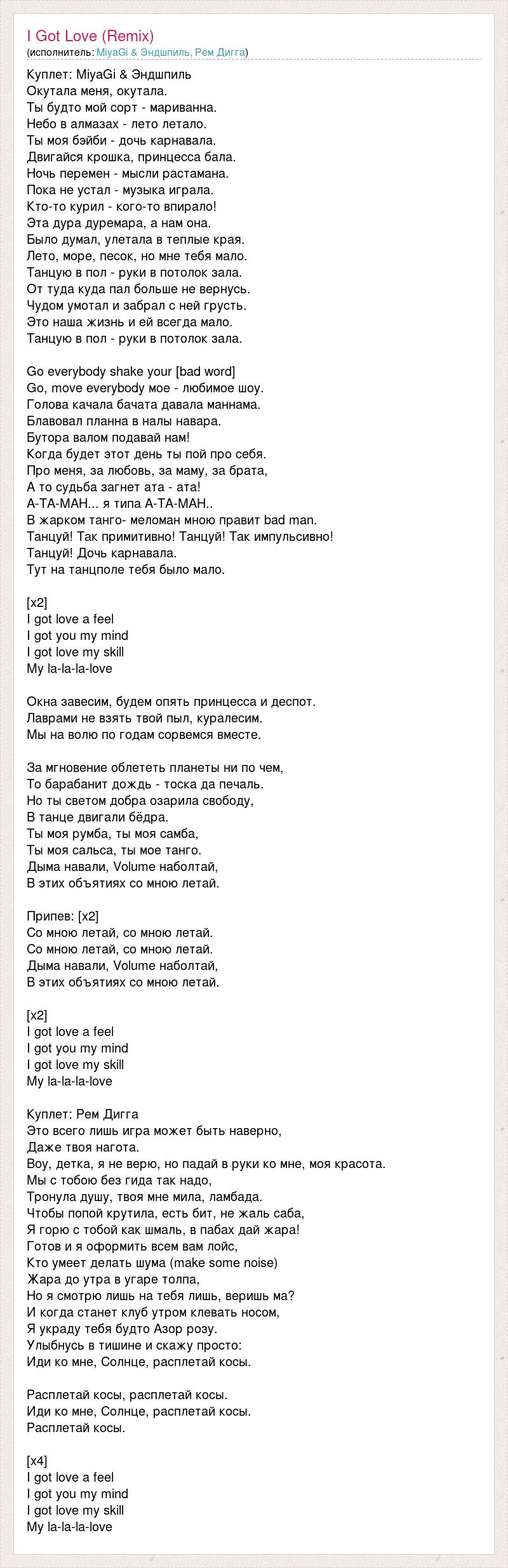 Куплет: MiyaGi & Эндшпиль Окутала меня, окутала. Ты будто мой сорт - мариванна. Небо в алмазах - лето летало. Ты моя бэйби - дочь карнавала. Двигайся крошка, принцесса бала. Ночь перемен - мысли растамана. Пока не устал - музыка играла. Кто-то курил - кого-то впирало! Эта дура дуремара, а нам она. Было думал, улетала в теплые края. Лето, море, песок, но мне тебя мало. Танцую в пол - руки в потолок зала. От туда куда пал больше не вернусь. Чудом умотал и забрал с ней грусть. Это наша жизнь и ей всегда мало. Танцую в пол - руки в потолок зала. Go everybody shake your [bad word] Go, move everybody мое - любимое шоу. Голова качала бачата давала маннама. Блавовал планна в налы навара. Бутора валом подавай нам! Когда будет этот день ты пой про себя. Про меня, за любовь, за маму, за брата, А то судьба загнет ата - ата! А-ТА-МАН... я типа А-ТА-МАН.. В жарком танго- меломан мною правит bad man. Танцуй! Так примитивно! Танцуй! Так импульсивно! Танцуй! Дочь карнавала. Тут на танцполе тебя было мало. [x2] I got love a feel I got you my mind I got love my skill My la-la-la-love Окна завесим, будем опять принцесса и деспот. Лаврами не взять твой пыл, куралесим. Мы на волю по годам сорвемся вместе. За мгновение облететь планеты ни по чем, То барабанит дождь - тоска да печаль. Но ты светом добра озарила свободу, В танце двигали бёдра. Ты моя румба, ты моя самба, Ты моя сальса, ты мое танго. Дыма навали, Volume наболтай, В этих объятиях со мною летай. Припев: [х2] Со мною летай, со мною летай. Со мною летай, со мною летай. Дыма навали, Volume наболтай, В этих объятиях со мною летай. [х2] I got love a feel I got you my mind I got love my skill My la-la-la-love Куплет: Рем Дигга Это всего лишь игра может быть наверно, Даже твоя нагота. Воу, детка, я не верю, но падай в руки ко мне, моя красота. Мы с тобою без гида так надо, Тронула душу, твоя мне мила, ламбада. Чтобы попой крутила, есть бит, не жаль саба, Я горю с тобой как шмаль, в пабах дай жара! Готов и я оформить всем вам лойс, Кто умеет делать шума (make some noise) Жара до утра в угаре толпа, Но я смотрю лишь на тебя лишь, веришь ма? И когда станет клуб утром клевать носом, Я украду тебя будто Азор розу. Улыбнусь в тишине и скажу просто: Иди ко мне, Солнце, расплетай косы. Расплетай косы, расплетай косы. Иди ко мне, Солнце, расплетай косы. Расплетай косы. [x4] I got love a feel I got you my mind I got love my skill My la-la-la-love