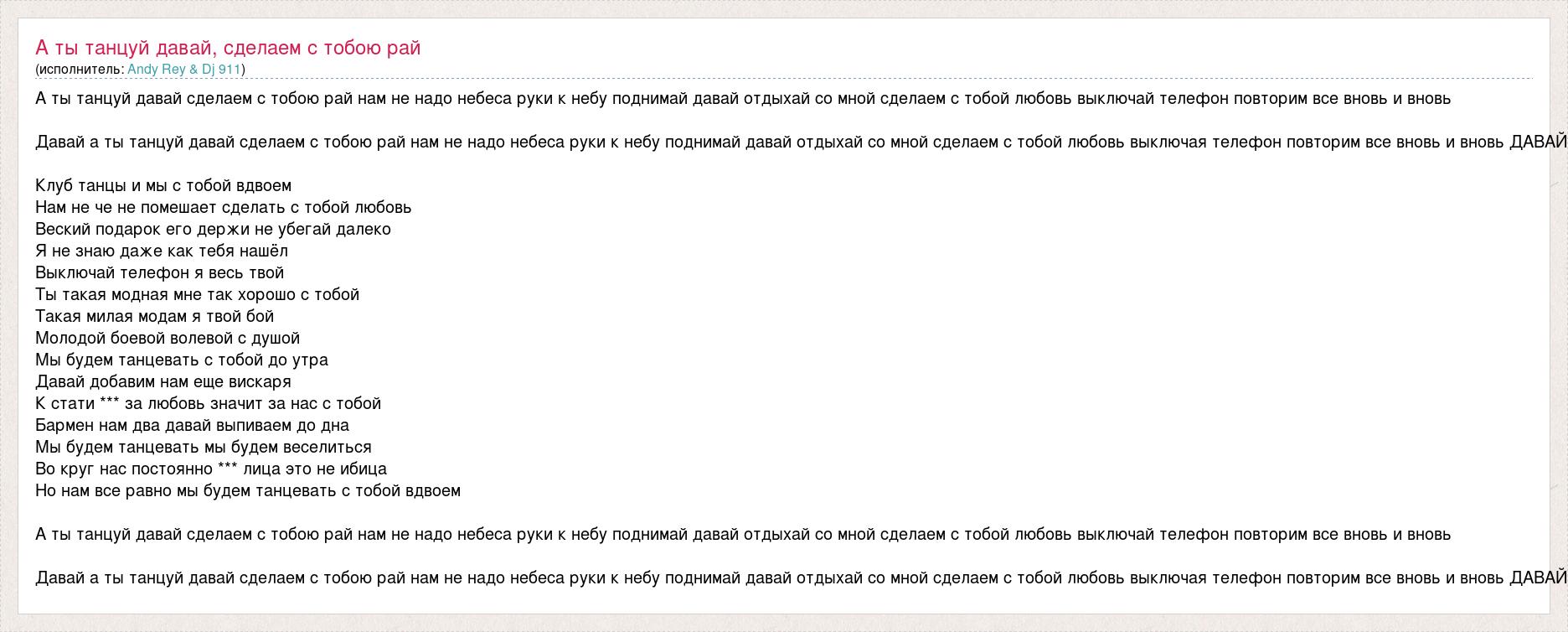 А ты танцуй давай сделаем с тобою рай нам не надо небеса руки к небу поднимай давай отдыхай со мной сделаем с тобой любовь выключай телефон повторим все вновь и вновь Давай а ты танцуй давай сделаем с тобою рай нам не надо небеса руки к небу поднимай давай отдыхай со мной сделаем с тобой любовь выключая телефон повторим все вновь и вновь ДАВАЙ Клуб танцы и мы с тобой вдвоем Нам не че не помешает сделать с тобой любовь Веский подарок его держи не убегай далеко Я не знаю даже как тебя нашёл Выключай телефон я весь твой Ты такая модная мне так хорошо с тобой Такая милая модам я твой бой Молодой боевой волевой с душой Мы будем танцевать с тобой до утра Давай добавим нам еще вискаря К стати *** за любовь значит за нас с тобой Бармен нам два давай выпиваем до дна Мы будем танцевать мы будем веселиться Во круг нас постоянно *** лица это не ибица Но нам все равно мы будем танцевать с тобой вдвоем А ты танцуй давай сделаем с тобою рай нам не надо небеса руки к небу поднимай давай отдыхай со мной сделаем с тобой любовь выключай телефон повторим все вновь и вновь Давай а ты танцуй давай сделаем с тобою рай нам не надо небеса руки к небу поднимай давай отдыхай со мной сделаем с тобой любовь выключая телефон повторим все вновь и вновь ДАВАЙ