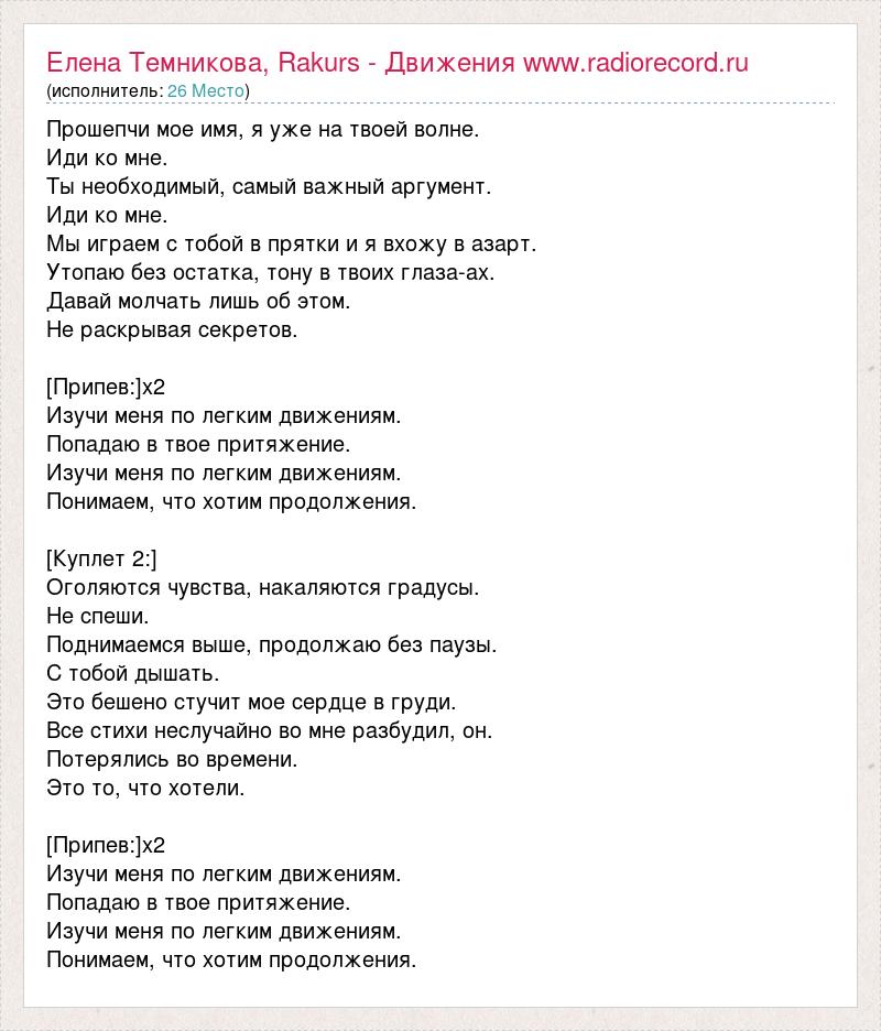 Прошепчи мое имя, я уже на твоей волне. Иди ко мне. Ты необходимый, самый важный аргумент. Иди ко мне. Мы играем с тобой в прятки и я вхожу в азарт. Утопаю без остатка, тону в твоих глаза-ах. Давай молчать лишь об этом. Не раскрывая секретов. [Припев:]х2 Изучи меня по легким движениям. Попадаю в твое притяжение. Изучи меня по легким движениям. Понимаем, что хотим продолжения. [Куплет 2:] Оголяются чувства, накаляются градусы. Не спеши. Поднимаемся выше, продолжаю без паузы. С тобой дышать. Это бешено стучит мое сердце в груди. Все стихи неслучайно во мне разбудил, он. Потерялись во времени. Это то, что хотели. [Припев:]х2 Изучи меня по легким движениям. Попадаю в твое притяжение. Изучи меня по легким движениям. Понимаем, что хотим продолжения.