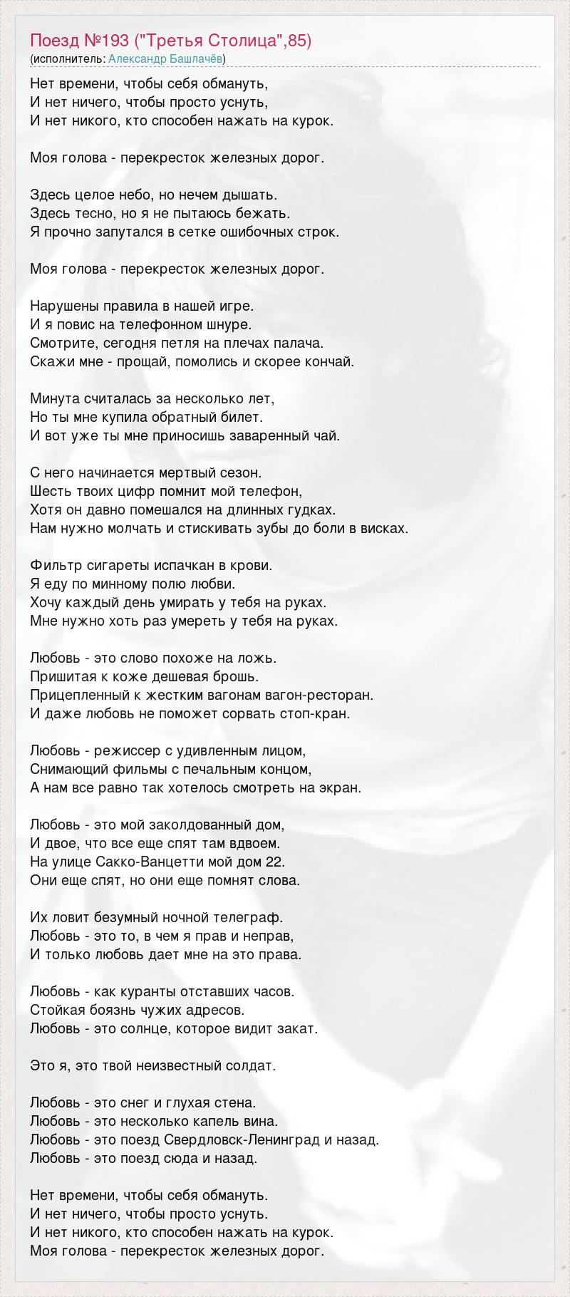 Нет времени, чтобы себя обмануть, И нет ничего, чтобы просто уснуть, И нет никого, кто способен нажать на курок. Моя голова - перекресток железных дорог. Здесь целое небо, но нечем дышать. Здесь тесно, но я не пытаюсь бежать. Я прочно запутался в сетке ошибочных строк. Моя голова - перекресток железных дорог. Нарушены правила в нашей игре. И я повис на телефонном шнуре. Смотрите, сегодня петля на плечах палача. Скажи мне - прощай, помолись и скорее кончай. Минута считалась за несколько лет, Но ты мне купила обратный билет. И вот уже ты мне приносишь заваренный чай. С него начинается мертвый сезон. Шесть твоих цифр помнит мой телефон, Хотя он давно помешался на длинных гудках. Нам нужно молчать и стискивать зубы до боли в висках. Фильтр сигареты испачкан в крови. Я еду по минному полю любви. Хочу каждый день умирать у тебя на руках. Мне нужно хоть раз умереть у тебя на руках. Любовь - это слово похоже на ложь. Пришитая к коже дешевая брошь. Прицепленный к жестким вагонам вагон-ресторан. И даже любовь не поможет сорвать стоп-кран. Любовь - режиссер с удивленным лицом, Снимающий фильмы с печальным концом, А нам все равно так хотелось смотреть на экран. Любовь - это мой заколдованный дом, И двое, что все еще спят там вдвоем. На улице Сакко-Ванцетти мой дом 22. Они еще спят, но они еще помнят слова. Их ловит безумный ночной телеграф. Любовь - это то, в чем я прав и неправ, И только любовь дает мне на это права. Любовь - как куранты отставших часов. Стойкая боязнь чужих адресов. Любовь - это солнце, которое видит закат. Это я, это твой неизвестный солдат. Любовь - это снег и глухая стена. Любовь - это несколько капель вина. Любовь - это поезд Свердловск-Ленинград и назад. Любовь - это поезд сюда и назад. Нет времени, чтобы себя обмануть. И нет ничего, чтобы просто уснуть. И нет никого, кто способен нажать на курок. Моя голова - перекресток железных дорог.