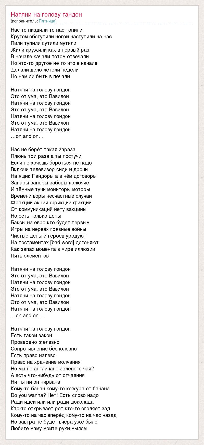 Нас то пиздили то нас топили Кругом обступили ногой наступили на нас Пили тупили кутили мутили Жили кружили как в первый раз В начале качали потом отвечали Но что-то другое не то что в начале Делали дело летели недели Но нам ли быть в печали Натяни на голову гондон Это от ума, это Вавилон Натяни на голову гондон Это от ума, это Вавилон Натяни на голову гондон Это от ума, это Вавилон Натяни на голову гондон …on and on… Нас не берёт такая зараза Плюнь три раза а ты постучи Если не хочешь бороться не надо Включи телевизор сиди и дрочи На ящик Пандоры а в нём договоры Запары запоры заборы колючие И тёмные тучи мониторы моторы Времени воры несчастные случаи Фракции акции фрикции фикции От коммуникаций нету вакцины Но есть только цены Баксы на евро кто будет первым Игры на нервах грязные войны Чистые деньги героев уродуют На постаментах [bad word] догоняют Как запах момента в мире иллюзии Пять элементов Натяни на голову гондон Это от ума, это Вавилон Натяни на голову гондон Это от ума, это Вавилон Натяни на голову гондон Это от ума, это Вавилон Натяни на голову гондон …on and on… Натяни на голову гондон Есть такой закон Проверено железно Сопротивление бесполезно Есть право налево Право на хранение молчания Но мы не англичане зелёного чая? А есть что-нибудь от отчаяния Ни ты ни он нирвана Кому-то банан кому-то кожура от банана Do you wanna? Нет! Есть слово надо Ради идеи или или ради шоколада Кто-то открывает рот кто-то оголяет зад Кому-то на час вперёд кому-то на час назад Но завтра не будет вчера уже было Любите маму мойте руки мылом