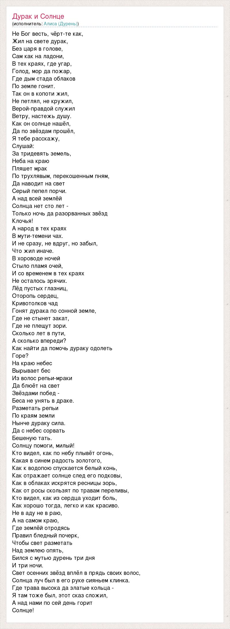 Не Бог весть, чёрт-те как, Жил на свете дурак, Без царя в голове, Сам как на ладони, В тех краях, где угар, Голод, мор да пожар, Где дым стада облаков По земле гонит. Так он в копоти жил, Не петлял, не кружил, Верой-правдой служил Ветру, настежь душу. Как он солнце нашёл, Да по звёздам прошёл, Я тебе расскажу, Слушай: За тридевять земель, Неба на краю Пляшет мрак По трухлявым, перекошенным пням, Да наводит на свет Серый пепел порчи. А над всей землёй Солнца нет сто лет - Только ночь да разорванных звёзд Клочья! А народ в тех краях В мути-темени чах. И не сразу, не вдруг, но забыл, Что жил иначе. В хороводе ночей Стыло пламя очей, И со временем в тех краях Не осталось зрячих. Лёд пустых глазниц, Оторопь сердец, Кривотолков чад Гонят дурака по сонной земле, Где не стынет закат, Где не плещут зори. Сколько лет в пути, А сколько впереди? Как найти да помочь дураку одолеть Горе? На краю небес Вырывает бес Из волос репьи-мраки Да блюёт на свет Звёздами побед - Беса не унять в драке. Разметать репьи По краям земли Нынче дураку сила. Да с небес сорвать Бешеную тать. Солнцу помоги, милый! Кто видел, как по небу плывёт огонь, Какая в синем радость золотого, Как к водопою спускается белый конь, Как отражает солнце след его подковы, Как в облаках искрятся ресницы зорь, Как от росы скользят по травам переливы, Кто видел, как из сердца уходит боль, Как хорошо тогда, легко и как красиво. Не в аду не в раю, А на самом краю, Где землёй отродясь Правил бледный почерк, Чтобы свет разметать Над землею опять, Бился с мутью дурень три дня И три ночи. Свет осенних звёзд вплёл в прядь своих волос, Солнца луч был в его руке сияньем клинка. Где трава высока да златые кольца - Я там тоже был, этот сказ сложил, А над нами по сей день горит Солнце!