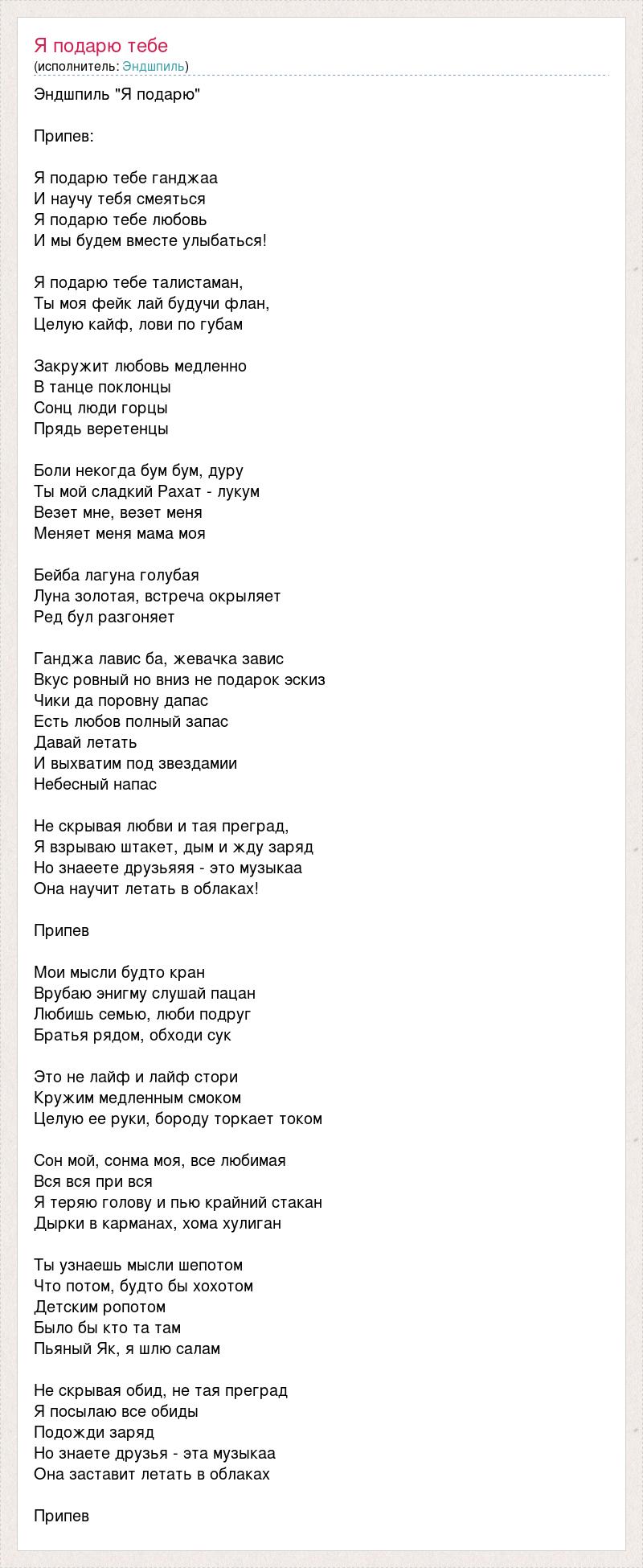 Эндшпиль "Я подарю" Припев: Я подарю тебе ганджаа И научу тебя смеяться Я подарю тебе любовь И мы будем вместе улыбаться! Я подарю тебе талистаман, Ты моя фейк лай будучи флан, Целую кайф, лови по губам Закружит любовь медленно В танце поклонцы Сонц люди горцы Прядь веретенцы Боли некогда бум бум, дуру Ты мой сладкий Рахат - лукум Везет мне, везет меня Меняет меня мама моя Бейба лагуна голубая Луна золотая, встреча окрыляет Ред бул разгоняет Ганджа лавис ба, жевачка завис Вкус ровный но вниз не подарок эскиз Чики да поровну дапас Есть любов полный запас Давай летать И выхватим под звездамии Небесный напас Не скрывая любви и тая преград, Я взрываю штакет, дым и жду заряд Но знаеете друзьяяя - это музыкаа Она научит летать в облаках! Припев Мои мысли будто кран Врубаю энигму слушай пацан Любишь семью, люби подруг Братья рядом, обходи сук Это не лайф и лайф стори Кружим медленным смоком Целую ее руки, бороду торкает током Сон мой, сонма моя, все любимая Вся вся при вся Я теряю голову и пью крайний стакан Дырки в карманах, хома хулиган Ты узнаешь мысли шепотом Что потом, будто бы хохотом Детским ропотом Было бы кто та там Пьяный Як, я шлю салам Не скрывая обид, не тая преград Я посылаю все обиды Подожди заряд Но знаете друзья - эта музыкаа Она заставит летать в облаках Припев