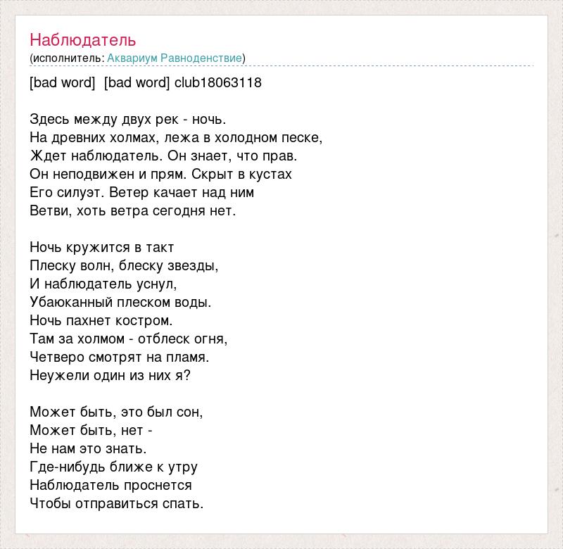 [bad word] [bad word] club18063118 Здесь между двух рек - ночь. На древних холмах, лежа в холодном песке, Ждет наблюдатель. Он знает, что прав. Он неподвижен и прям. Скрыт в кустах Его силуэт. Ветер качает над ним Ветви, хоть ветра сегодня нет. Ночь кружится в такт Плеску волн, блеску звезды, И наблюдатель уснул, Убаюканный плеском воды. Ночь пахнет костром. Там за холмом - отблеск огня, Четверо смотрят на пламя. Неужели один из них я? Может быть, это был сон, Может быть, нет - Не нам это знать. Где-нибудь ближе к утру Наблюдатель проснется Чтобы отправиться спать.