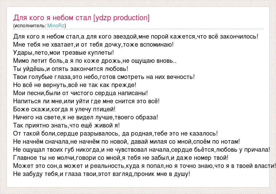 Для кого я небом стал,а для кого звездой,мне порой кажется,что всё закончилось! Мне тебя не хватает,и от тебя дочку,тоже вспоминаю! Удары,лето,мои трезвые куплеты! Мимо летит боль,а я по коже дрожь,не ощущаю вновь.. Ты уйдёшь,и опять закончится любовь! Твои голубые глаза,это небо,готов смотреть на них вечность! Но всё не вернуть,всё не так как прежде! Мои песни,были от чистого сердца написаны! Напиться ли мне,или уйти где мне снится это всё! Боже скажи,когда я улечу птицей! Ничего на свете,я не видел лучше,твоего образа! Так приятно знать,что ещё живой я! От такой боли,сердце разрывалось, да родная,тебе это не казалось! Не начнём сначала,не начнём по новой, давай милая со мной,споём по нотам! Не ощущал твоих губ никогда,и не чувствовал начала,сердце бьётся,любовь у причала! Главное ты не молчи,говори со мной,я тебя не забыл,и даже номер твой! Может это сон,а может и реальность,куда я попал,но я точно знаю,что я в твоей власти! Не забуду тебя,и глаза твои,этот взгляд,проник мне в душу!