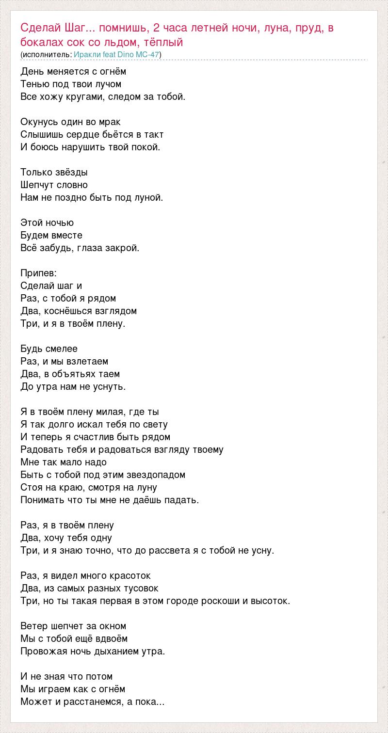 День меняется с огнём Тенью под твои лучом Все хожу кругами, следом за тобой. Окунусь один во мрак Слышишь сердце бьётся в такт И боюсь нарушить твой покой. Только звёзды Шепчут словно Нам не поздно быть под луной. Этой ночью Будем вместе Всё забудь, глаза закрой. Припев: Сделай шаг и Раз, с тобой я рядом Два, коснёшься взглядом Три, и я в твоём плену. Будь смелее Раз, и мы взлетаем Два, в объятьях таем До утра нам не уснуть. Я в твоём плену милая, где ты Я так долго искал тебя по свету И теперь я счастлив быть рядом Радовать тебя и радоваться взгляду твоему Мне так мало надо Быть с тобой под этим звездопадом Стоя на краю, смотря на луну Понимать что ты мне не даёшь падать. Раз, я в твоём плену Два, хочу тебя одну Три, и я знаю точно, что до рассвета я с тобой не усну. Раз, я видел много красоток Два, из самых разных тусовок Три, но ты такая первая в этом городе роскоши и высоток. Ветер шепчет за окном Мы с тобой ещё вдвоём Провожая ночь дыханием утра. И не зная что потом Мы играем как с огнём Может и расстанемся, а пока...
