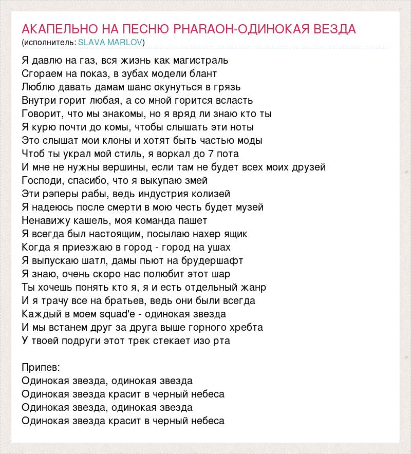 Я давлю на газ, вся жизнь как магистраль Сгораем на показ, в зубах модели блант Люблю давать дамам шанс окунуться в грязь Внутри горит любая, а со мной горится всласть Говорит, что мы знакомы, но я вряд ли знаю кто ты Я курю почти до комы, чтобы слышать эти ноты Это слышат мои клоны и хотят быть частью моды Чтоб ты украл мой стиль, я воркал до 7 пота И мне не нужны вершины, если там не будет всех моих друзей Господи, спасибо, что я выкупаю змей Эти рэперы рабы, ведь индустрия колизей Я надеюсь после смерти в мою честь будет музей Ненавижу кашель, моя команда пашет Я всегда был настоящим, посылаю нахер ящик Когда я приезжаю в город - город на ушах Я выпускаю шатл, дамы пьют на брудершафт Я знаю, очень скоро нас полюбит этот шар Ты хочешь понять кто я, я и есть отдельный жанр И я трачу все на братьев, ведь они были всегда Каждый в моем squad'е - одинокая звезда И мы встанем друг за друга выше горного хребта У твоей подруги этот трек стекает изо рта Припев: Одинокая звезда, одинокая звезда Одинокая звезда красит в черный небеса Одинокая звезда, одинокая звезда Одинокая звезда красит в черный небеса