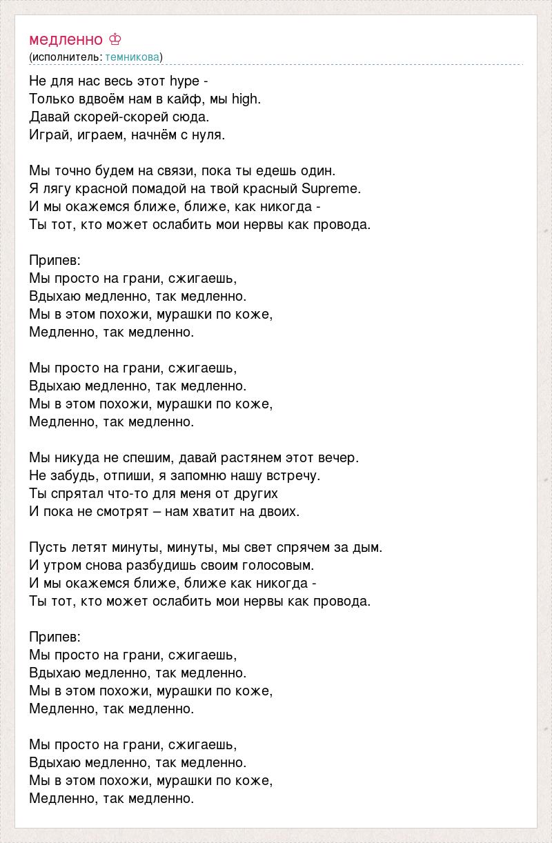 Не для нас весь этот hype - Только вдвоём нам в кайф, мы high. Давай скорей-скорей сюда. Играй, играем, начнём с нуля. Мы точно будем на связи, пока ты едешь один. Я лягу красной помадой на твой красный Supreme. И мы окажемся ближе, ближе, как никогда - Ты тот, кто может ослабить мои нервы как провода. Припев: Мы просто на грани, сжигаешь, Вдыхаю медленно, так медленно. Мы в этом похожи, мурашки по коже, Медленно, так медленно. Мы просто на грани, сжигаешь, Вдыхаю медленно, так медленно. Мы в этом похожи, мурашки по коже, Медленно, так медленно. Мы никуда не спешим, давай растянем этот вечер. Не забудь, отпиши, я запомню нашу встречу. Ты спрятал что-то для меня от других И пока не смотрят – нам хватит на двоих. Пусть летят минуты, минуты, мы свет спрячем за дым. И утром снова разбудишь своим голосовым. И мы окажемся ближе, ближе как никогда - Ты тот, кто может ослабить мои нервы как провода. Припев: Мы просто на грани, сжигаешь, Вдыхаю медленно, так медленно. Мы в этом похожи, мурашки по коже, Медленно, так медленно. Мы просто на грани, сжигаешь, Вдыхаю медленно, так медленно. Мы в этом похожи, мурашки по коже, Медленно, так медленно.