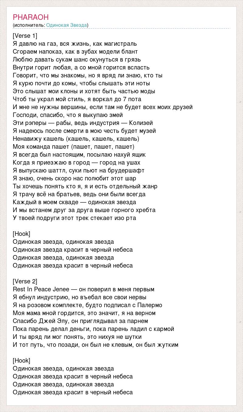 [Verse 1] Я давлю на газ, вся жизнь, как магистраль Сгораем напоказ, как в зубах модели блант Люблю давать сукам шанс окунуться в грязь Внутри горит любая, а со мной горится всласть Говорит, что мы знакомы, но я вряд ли знаю, кто ты Я курю почти до комы, чтобы слышать эти ноты Это слышат мои клоны и хотят быть частью моды Чтоб ты украл мой стиль, я воркал до 7 пота И мне не нужны вершины, если там не будет всех моих друзей Господи, спасибо, что я выкупаю змей Эти рэперы — рабы, ведь индустрия — Колизей Я надеюсь после смерти в мою честь будет музей Ненавижу кашель (кашель, кашель, кашель) Моя команда пашет (пашет, пашет, пашет) Я всегда был настоящим, посылаю нахуй ящик Когда я приезжаю в город — город на ушах Я выпускаю шаттл, суки пьют на брудершафт Я знаю, очень скоро нас полюбит этот шар Ты хочешь понять кто я, я и есть отдельный жанр Я трачу всё на братьев, ведь они были всегда Каждый в моем скваде — одинокая звезда И мы встанем друг за друга выше горного хребта У твоей подруги этот трек стекает изо рта [Hook] Одинокая звезда, одинокая звезда Одинокая звезда красит в черный небеса Одинокая звезда, одинокая звезда Одинокая звезда красит в черный небеса [Verse 2] Rest In Peace Jenee — он поверил в меня первым Я ебнул индустрию, но въебал все свои нервы Я на розовом комплекте, будто подписал с Палермо Моя мама мной гордится, это значит, я на верном Спасибо Джей Элу, он приглядывал за парнем Пока парень делал деньги, пока парень ладил с кармой И ты вряд ли мог понять, это нихуя не шутки И тот путь, что позади, он был не клевым, он был жутким [Hook] Одинокая звезда, одинокая звезда Одинокая звезда красит в черный небеса Одинокая звезда, одинокая звезда Одинокая звезда красит в черный небеса