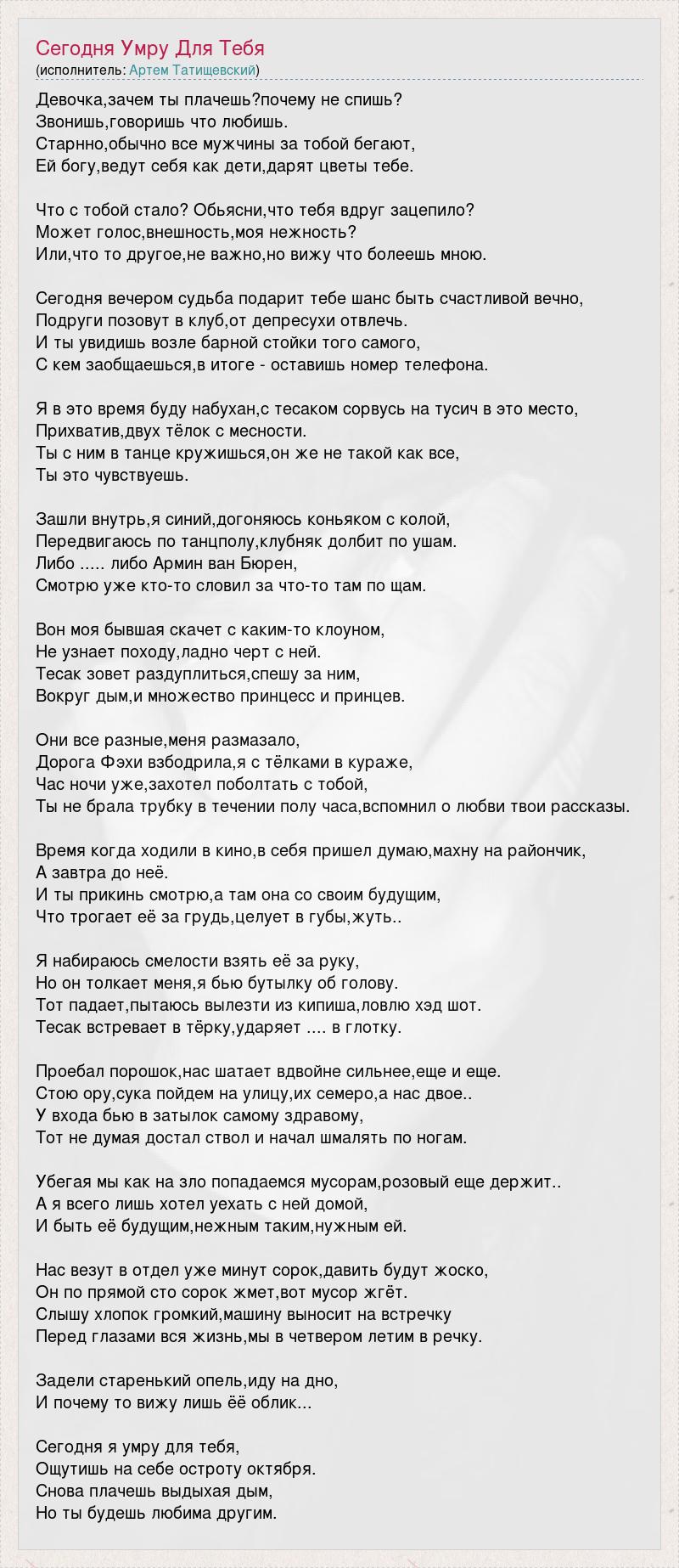 Девочка,зачем ты плачешь?почему не спишь? Звонишь,говоришь что любишь. Старнно,обычно все мужчины за тобой бегают, Ей богу,ведут себя как дети,дарят цветы тебе. Что с тобой стало? Обьясни,что тебя вдруг зацепило? Может голос,внешность,моя нежность? Или,что то другое,не важно,но вижу что болеешь мною. Сегодня вечером судьба подарит тебе шанс быть счастливой вечно, Подруги позовут в клуб,от депресухи отвлечь. И ты увидишь возле барной стойки того самого, С кем заобщаешься,в итоге - оставишь номер телефона. Я в это время буду набухан,с тесаком сорвусь на тусич в это место, Прихватив,двух тёлок с месности. Ты с ним в танце кружишься,он же не такой как все, Ты это чувствуешь. Зашли внутрь,я синий,догоняюсь коньяком с колой, Передвигаюсь по танцполу,клубняк долбит по ушам. Либо ..... либо Армин ван Бюрен, Смотрю уже кто-то словил за что-то там по щам. Вон моя бывшая скачет с каким-то клоуном, Не узнает походу,ладно черт с ней. Тесак зовет раздуплиться,спешу за ним, Вокруг дым,и множество принцесс и принцев. Они все разные,меня размазало, Дорога Фэхи взбодрила,я с тёлками в кураже, Час ночи уже,захотел поболтать с тобой, Ты не брала трубку в течении полу часа,вспомнил о любви твои рассказы. Время когда ходили в кино,в себя пришел думаю,махну на райончик, А завтра до неё. И ты прикинь смотрю,а там она со своим будущим, Что трогает её за грудь,целует в губы,жуть.. Я набираюсь смелости взять её за руку, Но он толкает меня,я бью бутылку об голову. Тот падает,пытаюсь вылезти из кипиша,ловлю хэд шот. Тесак встревает в тёрку,ударяет .... в глотку. Проебал порошок,нас шатает вдвойне сильнее,еще и еще. Стою ору,сука пойдем на улицу,их семеро,а нас двое.. У входа бью в затылок самому здравому, Тот не думая достал ствол и начал шмалять по ногам. Убегая мы как на зло попадаемся мусорам,розовый еще держит.. А я всего лишь хотел уехать с ней домой, И быть её будущим,нежным таким,нужным ей. Нас везут в отдел уже минут сорок,давить будут жоско, Он по прямой сто сорок жмет,вот мусор жгёт. Слышу хлопок громкий,машину выносит на встречку Перед глазами вся жизнь,мы в четвером летим в речку. Задели старенький опель,иду на дно, И почему то вижу лишь ёё облик... Сегодня я умру для тебя, Ощутишь на себе остроту октября. Снова плачешь выдыхая дым, Но ты будешь любима другим.