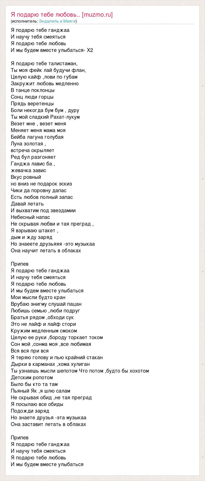 Я подарю тебе ганджаа И научу тебя смеяться Я подарю тебе любовь И мы будем вместе улыбаться- Х2 Я подарю тебе талистаман, Ты моя фейк лай будучи флан, Целую кайф ,лови по губам Закружит любовь медленно В танце поклонцы Сонц люди горцы Прядь веретенцы Боли некогда бум бум , дуру Ты мой сладкий Рахат-лукум Везет мне , везет меня Меняет меня мама моя Бейба лагуна голубая Луна золотая , встреча окрыляет Ред бул разгоняет Ганджа лавис ба , жевачка завис Вкус ровный но вниз не подарок эскиз Чики да поровну дапас Есть любов полный запас Давай летать И выхватим под звездамии Небесный напас Не скрывая любви и тая преград , Я взрываю штакет , дым и жду заряд Но знаеете друзьяяя -это музыкаа Она научит летать в облаках Припев Я подарю тебе ганджаа И научу тебя смеяться Я подарю тебе любовь И мы будем вместе улыбаться Мои мысли будто кран Врубаю энигму слушай пацан Любишь семью ,люби подруг Братья рядом ,обходи сук Это не лайф и лайф стори Кружим медленным смоком Целую ее руки ,бороду торкает током Сон мой ,сонма моя ,все любимая Вся вся при вся Я теряю голову и пью крайний стакан Дырки в карманах ,хома хулиган Ты узнаешь мысли шепотом Что потом ,будто бы хохотом Детским ропотом Было бы кто та там Пьяный Як ,я шлю салам Не скрывая обид ,не тая преград Я посылаю все обиды Подожди заряд Но знаете друзья -эта музыкаа Она заставит летать в облаках Припев Я подарю тебе ганджаа И научу тебя смеяться Я подарю тебе любовь И мы будем вместе улыбаться