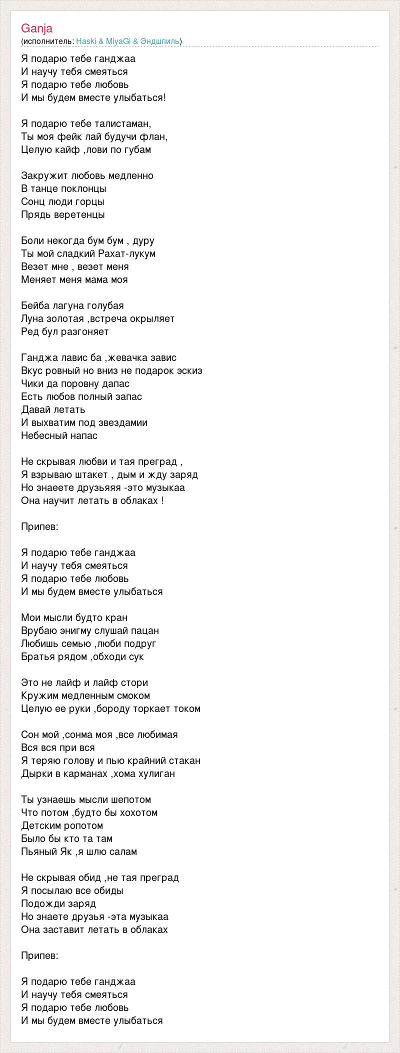 Я подарю тебе ганджаа И научу тебя смеяться Я подарю тебе любовь И мы будем вместе улыбаться! Я подарю тебе талистаман, Ты моя фейк лай будучи флан, Целую кайф ,лови по губам Закружит любовь медленно В танце поклонцы Сонц люди горцы Прядь веретенцы Боли некогда бум бум , дуру Ты мой сладкий Рахат-лукум Везет мне , везет меня Меняет меня мама моя Бейба лагуна голубая Луна золотая ,встреча окрыляет Ред бул разгоняет Ганджа лавис ба ,жевачка завис Вкус ровный но вниз не подарок эскиз Чики да поровну дапас Есть любов полный запас Давай летать И выхватим под звездамии Небесный напас Не скрывая любви и тая преград , Я взрываю штакет , дым и жду заряд Но знаеете друзьяяя -это музыкаа Она научит летать в облаках ! Припев: Я подарю тебе ганджаа И научу тебя смеяться Я подарю тебе любовь И мы будем вместе улыбаться Мои мысли будто кран Врубаю энигму слушай пацан Любишь семью ,люби подруг Братья рядом ,обходи сук Это не лайф и лайф стори Кружим медленным смоком Целую ее руки ,бороду торкает током Сон мой ,сонма моя ,все любимая Вся вся при вся Я теряю голову и пью крайний стакан Дырки в карманах ,хома хулиган Ты узнаешь мысли шепотом Что потом ,будто бы хохотом Детским ропотом Было бы кто та там Пьяный Як ,я шлю салам Не скрывая обид ,не тая преград Я посылаю все обиды Подожди заряд Но знаете друзья -эта музыкаа Она заставит летать в облаках Припев: Я подарю тебе ганджаа И научу тебя смеяться Я подарю тебе любовь И мы будем вместе улыбаться