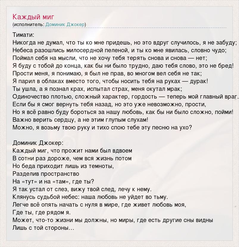 Тимати: Никогда не думал, что ты ко мне придешь, но это вдруг случилось, я не забуду; Небеса разошлись милосердной пеленой, и ты ко мне явилась, словно чудо; Поймал себя на мысли, что не хочу тебя терять снова и снова — нет; Я буду с тобой до конца, как бы ни было трудно, даю тебя слово, это не бред! Прости меня, я понимаю, я был не прав, во многом вел себя не так; Я парил в облаках вместо того, чтобы носить тебя на руках — дурак! Ты ушла, а я познал крах, испытал страх, меня окутал мрак; Одиночество плотью, сложный характер, гордость — теперь мой главный враг. Если бы я смог вернуть тебя назад, но это уже невозможно, прости, Но я всё равно буду бороться за нашу любовь, как бы ни было сложно, пойми! Важно верить сердцу, а не этим глупым слухам! Можно, я возьму твою руку и тихо спою тебе эту песню на ухо? Доминик Джокер: Каждый миг, что прожит нами был вдвоем В сотни раз дороже, чем вся жизнь потом Но беда приходит лишь из темноты, Разделив пространство На «тут» и на «там», где ты? Я так устал от слез, вижу твой след, лечу к нему. Клянусь судьбой небес: наша любовь не уйдет во тьму. Легче всё опять начать с нуля в мире, где живет любовь моя, Где ты, где рядом я. Может, что-то жизни мы должны, но миры, где есть другие сны видны Лишь с той стороны…