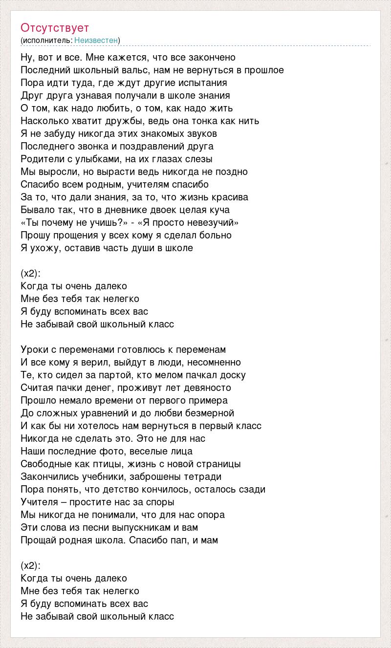Ну, вот и все. Мне кажется, что все закончено Последний школьный вальс, нам не вернуться в прошлое Пора идти туда, где ждут другие испытания Друг друга узнавая получали в школе знания О том, как надо любить, о том, как надо жить Насколько хватит дружбы, ведь она тонка как нить Я не забуду никогда этих знакомых звуков Последнего звонка и поздравлений друга Родители с улыбками, на их глазах слезы Мы выросли, но вырасти ведь никогда не поздно Спасибо всем родным, учителям спасибо За то, что дали знания, за то, что жизнь красива Бывало так, что в дневнике двоек целая куча «Ты почему не учишь?» - «Я просто невезучий» Прошу прощения у всех кому я сделал больно Я ухожу, оставив часть души в школе (х2): Когда ты очень далеко Мне без тебя так нелегко Я буду вспоминать всех вас Не забывай свой школьный класс Уроки с переменами готовлюсь к переменам И все кому я верил, выйдут в люди, несомненно Те, кто сидел за партой, кто мелом пачкал доску Считая пачки денег, проживут лет девяносто Прошло немало времени от первого примера До сложных уравнений и до любви безмерной И как бы ни хотелось нам вернуться в первый класс Никогда не сделать это. Это не для нас Наши последние фото, веселые лица Свободные как птицы, жизнь с новой страницы Закончились учебники, заброшены тетради Пора понять, что детство кончилось, осталось сзади Учителя – простите нас за споры Мы никогда не понимали, что для нас опора Эти слова из песни выпускникам и вам Прощай родная школа. Спасибо пап, и мам (х2): Когда ты очень далеко Мне без тебя так нелегко Я буду вспоминать всех вас Не забывай свой школьный класс