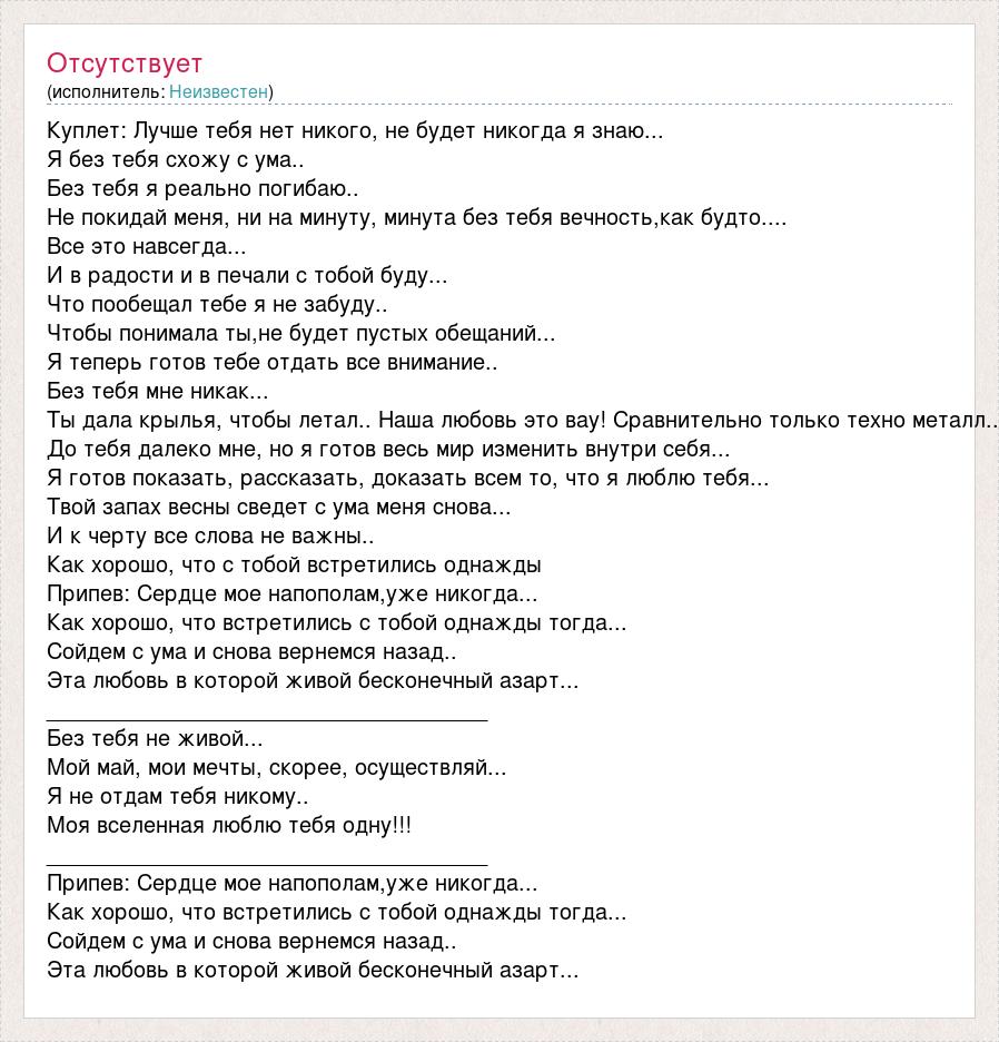 Куплет: Лучше тебя нет никого, не будет никогда я знаю... Я без тебя схожу с ума.. Без тебя я реально погибаю.. Не покидай меня, ни на минуту, минута без тебя вечность,как будто.... Все это навсегда... И в радости и в печали с тобой буду... Что пообещал тебе я не забуду.. Чтобы понимала ты,не будет пустых обещаний... Я теперь готов тебе отдать все внимание.. Без тебя мне никак... Ты дала крылья, чтобы летал.. Наша любовь это вау! Сравнительно только техно металл.. До тебя далеко мне, но я готов весь мир изменить внутри себя... Я готов показать, рассказать, доказать всем то, что я люблю тебя... Твой запах весны сведет с ума меня снова... И к черту все слова не важны.. Как хорошо, что с тобой встретились однажды Припев: Сердце мое напополам,уже никогда... Как хорошо, что встретились с тобой однажды тогда... Сойдем с ума и снова вернемся назад.. Эта любовь в которой живой бесконечный азарт... ____________________________________ Без тебя не живой... Мой май, мои мечты, скорее, осуществляй... Я не отдам тебя никому.. Моя вселенная люблю тебя одну!!! ____________________________________ Припев: Сердце мое напополам,уже никогда... Как хорошо, что встретились с тобой однажды тогда... Сойдем с ума и снова вернемся назад.. Эта любовь в которой живой бесконечный азарт...
